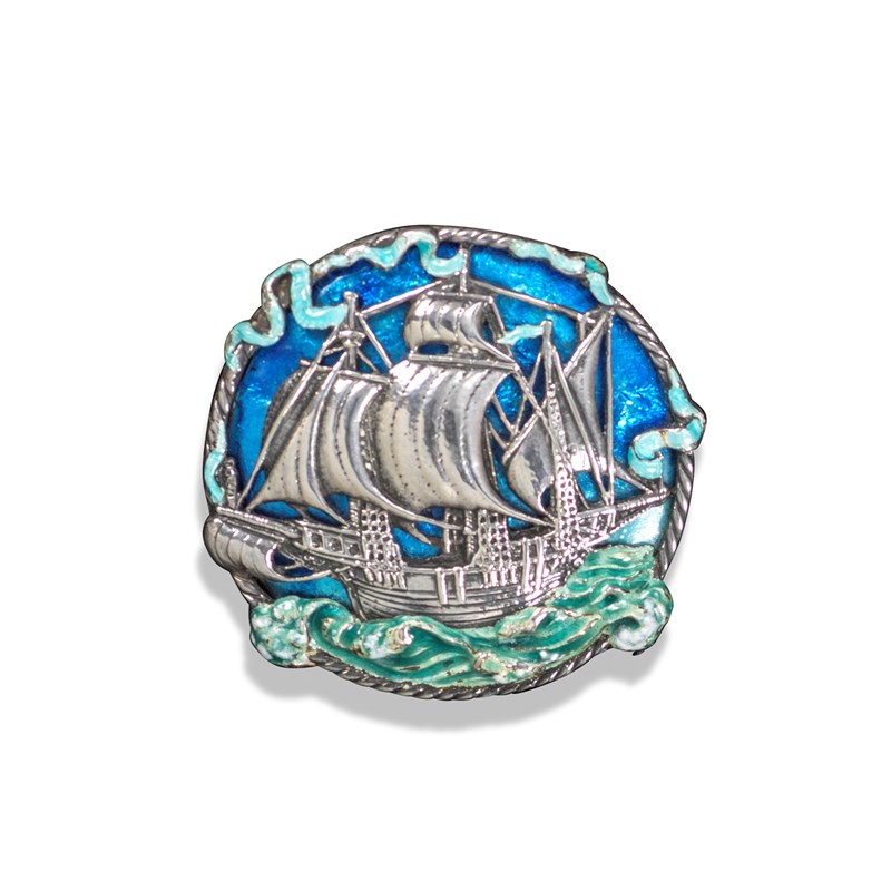An Arts & Crafts silver and enamel brooch by Ramsden & Carr, the circular plaque embossed in silver depicting a galleon in full sail sea-green enamelled waves and translucent blue enamel sky, engraved to reverse 'GOOD LUCK 2nd SEPTEMBER 1924 WITH ALL WYNN'S LOVE, OMAR RAMSDEN ME FECIT', 4.4cm wide, fitted case