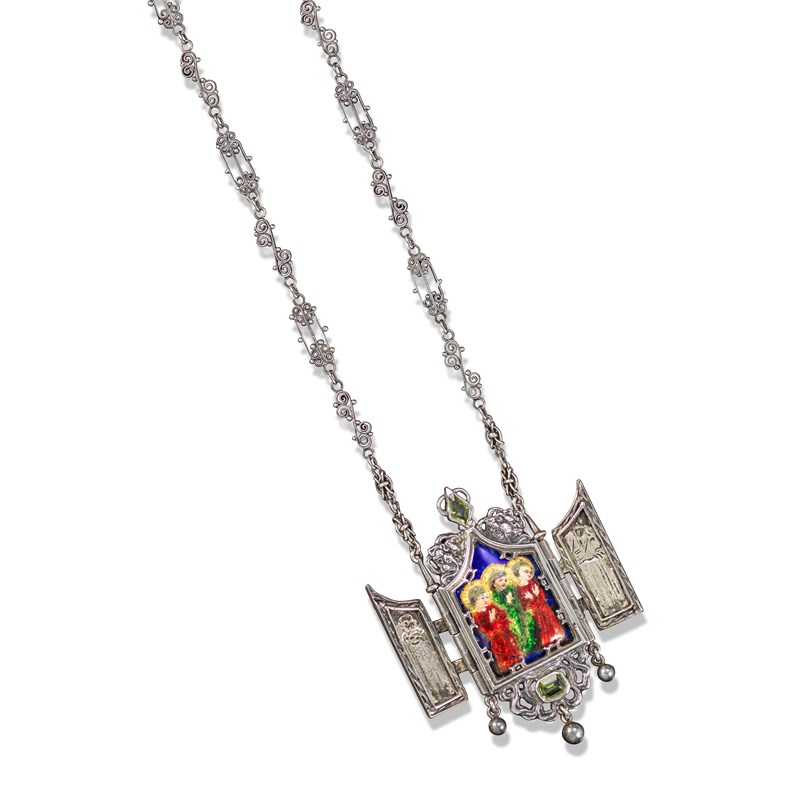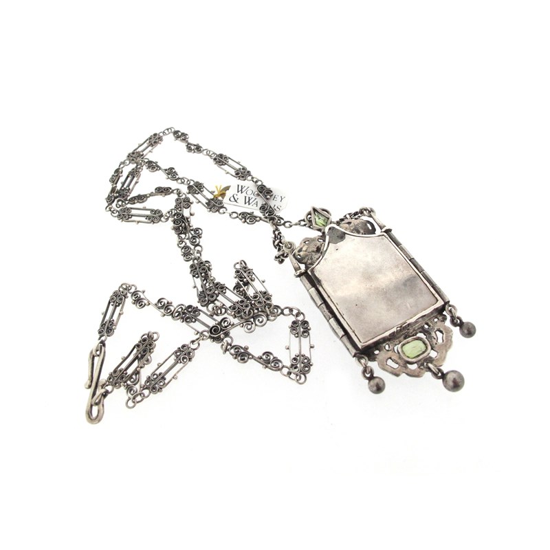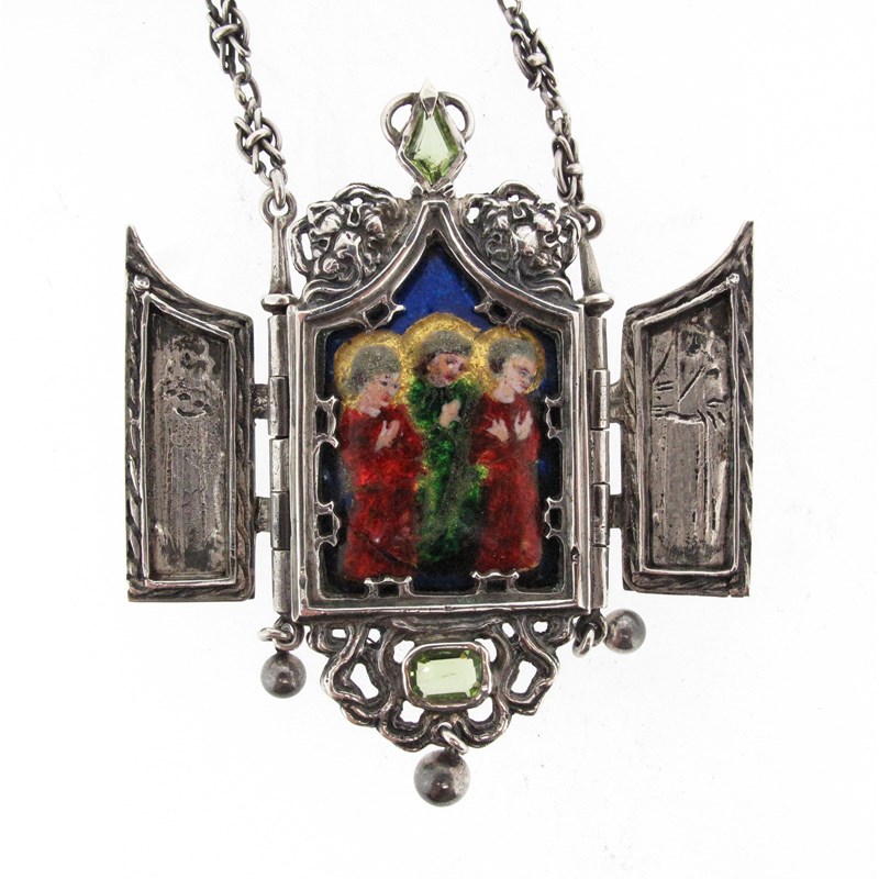 An Arts & Crafts silver tabernacle pendant by Ramsden & Carr, the rectangular silver plaque with double front door embossed with the figures of Medieval troubadours and hinged opening revealing a polychrome enamel plaque of three kneeling saints with golden haloes on blue enamel; the frame set with a kite-shaped peridot with an emerald-cut peridot below, suspending three silver sphere drops, on fancy silver wirework necklace, London hallmarks for 1905, maker's mark, pendant 7cm high, chain 70cm long