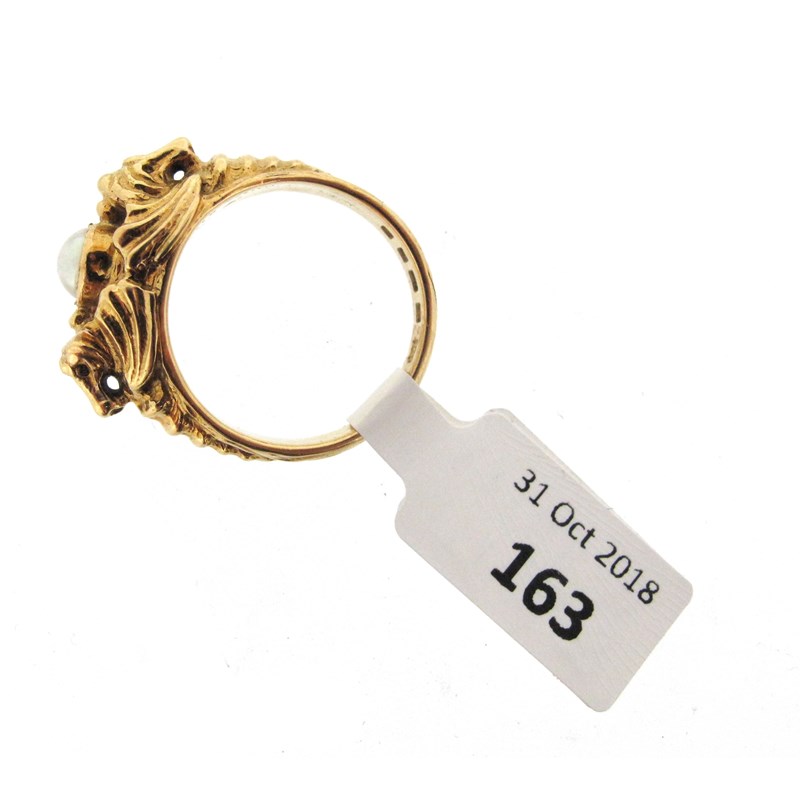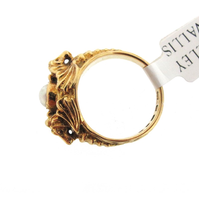A gold ring by Omar Ramsden, centred with a half pearl within intertwined embossed seahorses, engraved to interior 14 July 1933 and OMAR RAMSDEN ME FECIT, London hallmarks for 1933, maker's mark, size M