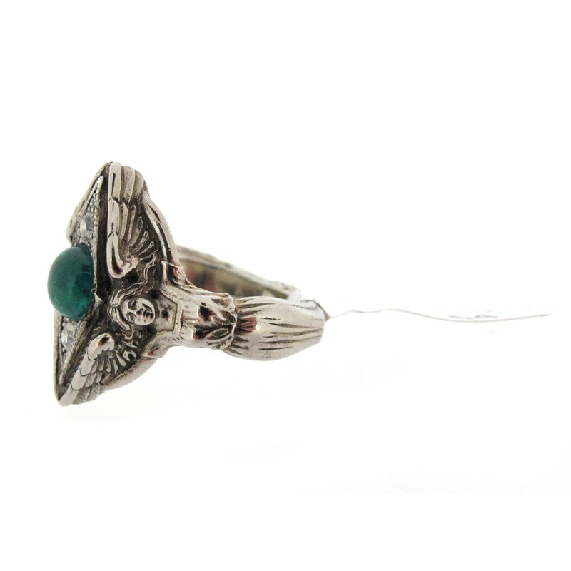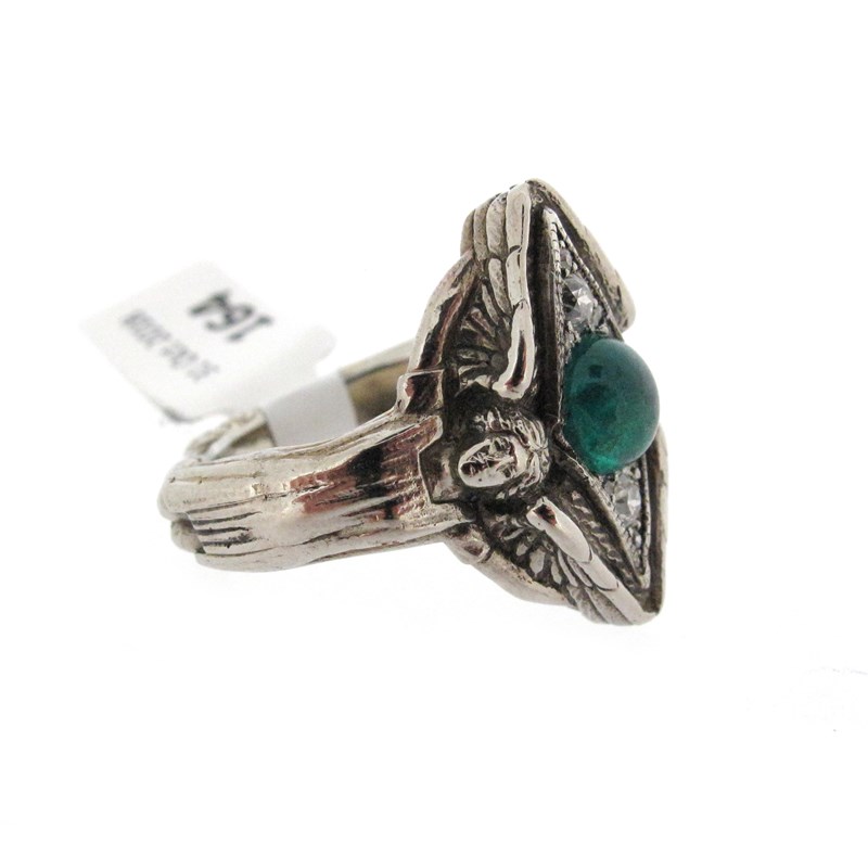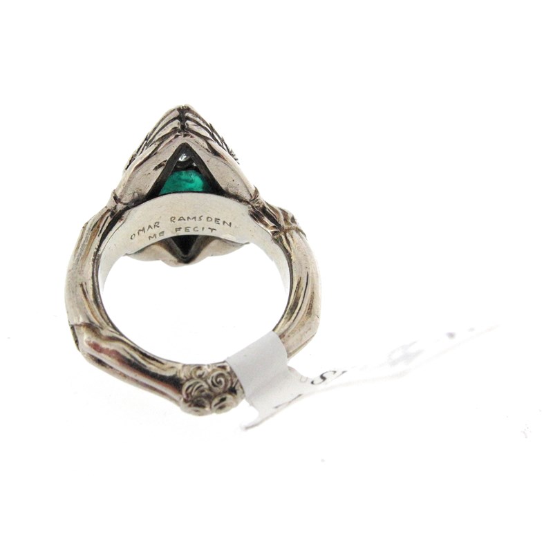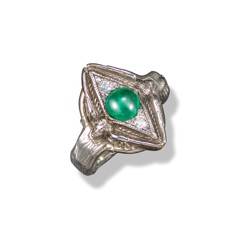 A lozenge-shaped white gold ring by Omar Ramsden, c1925, set with an emerald cabochon and two diamonds within white gold lozenge border held on the outstretched arms of two winged deities, their legs extending to form the architectural-style hoop with scroll embossed back, polished inner plate engraved 'OMAR RAMSDEN ME FECIT', size N
