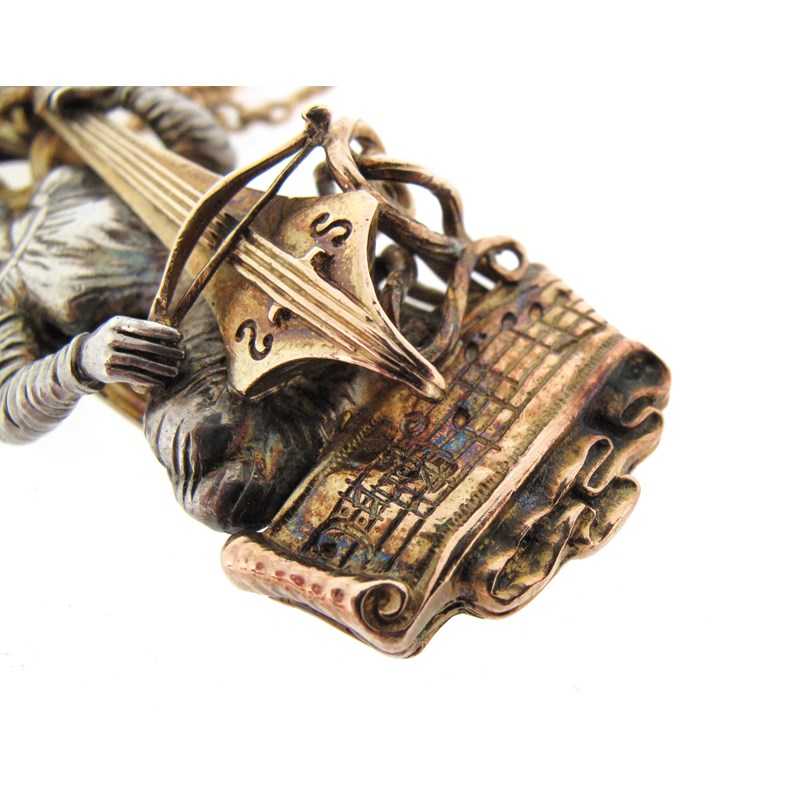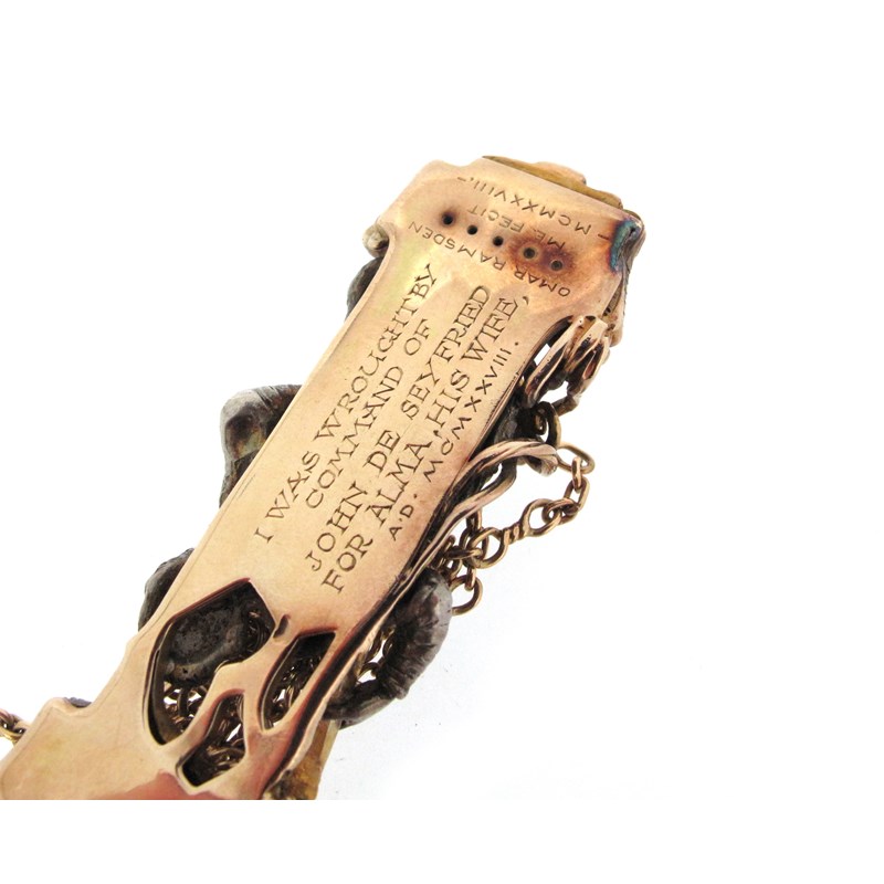 An Arts and Crafts Medieval-inspired pendant by Omar Ramsden, the silver kneeling maiden playing a stringed instrument against naturalistic backdrop, with a musical score set underneath, the reverse engraved with the inscription 'I WAS WROUGHT BY COMMAND OF JOHN DE SEYFRIED FOR ALMA HIS WIFE A.D.MCMXXVIII (1928)', signed 'OMAR RAMSDEN ME FECIT', pendant 7.7cm high, chain 81cm long, fitted Wartski case
