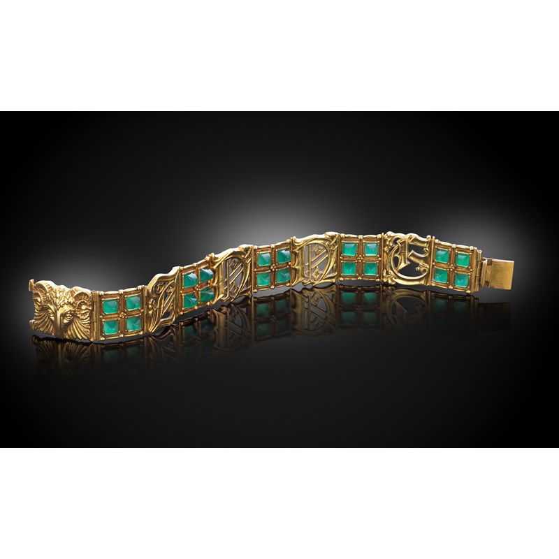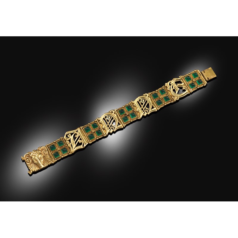 A gold bracelet by Omar Ramsden, composed of four uniform square plaques, each set with four conical chrysoprase cabochons in beaded borders, each plaque separated by a Gothic script letter spelling out the name ANNE, the clasp embossed with the head of a ram in fluted frame, London hallmarks for 1931, maker's mark and engraved OMAR RAMSDEN ME FECIT MCMXXXI, 19.5cm long, 65.5g