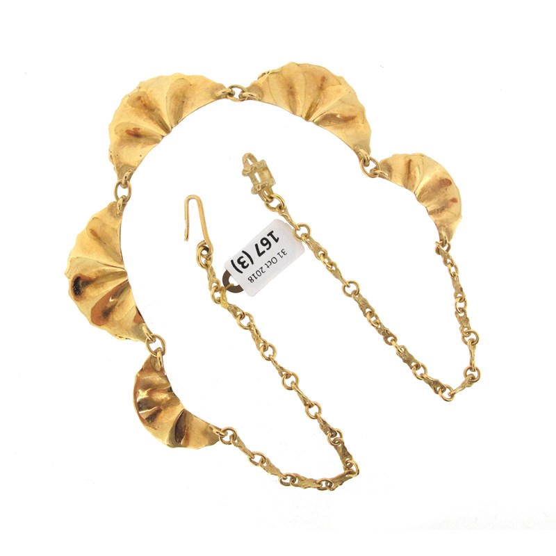 A yellow gold necklace and earrings, the necklace formed with five graduated leaf-form links, textured to one side and polished to the other, and a pair of similar leaf-form gold earrings, the necklace 43cm