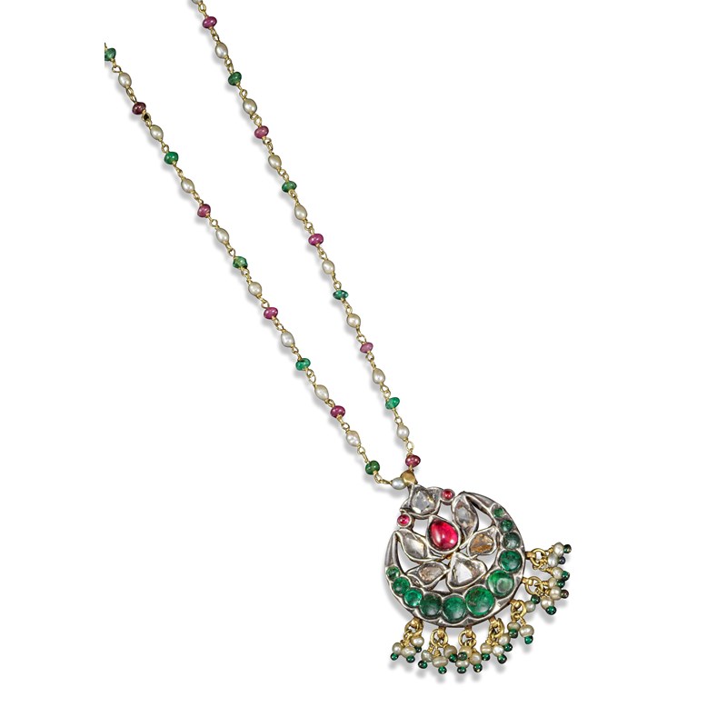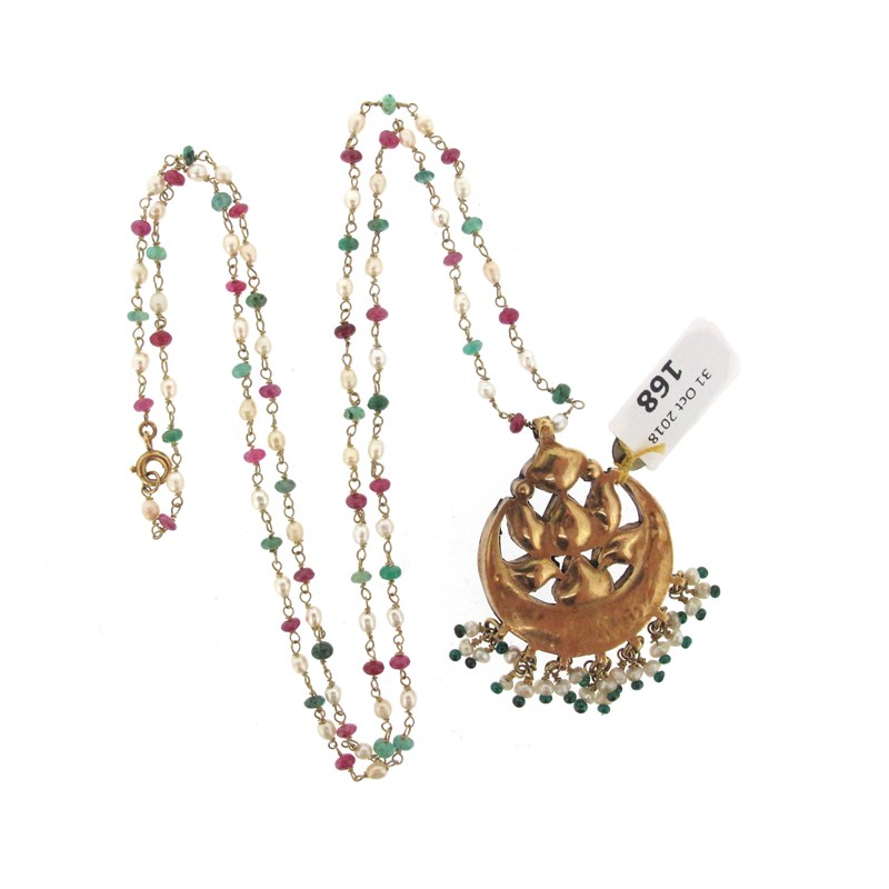 An Indian gem-set silver and gold pendant, the openwork closed crescent form pendant is set with emeralds, rubies and rose-cut diamonds with a fringe of seed pearls, on a fine link gold neck chain set with ruby and emerald beads and seed pearls, the pendant 4cm high, the chain 57cm