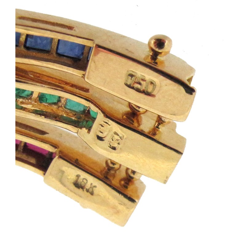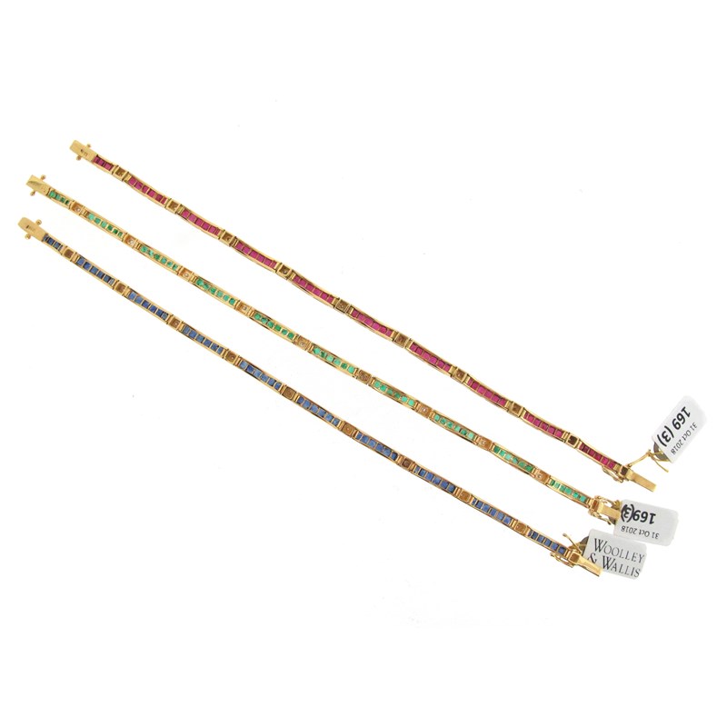 Three similar yellow gold line bracelets, one with square-shaped sapphires separated with diamonds, another with rubies and diamonds and the other with emeralds and diamonds, each 19cm