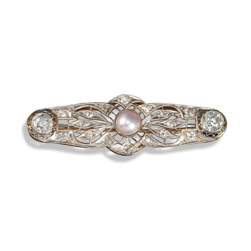 An Edwardian diamond and pearl set brooch, c1910, of pierced foliate form, centred with a pearl and two larger old circular-cut terminal diamonds, set in platinum on gold, 5cm wide