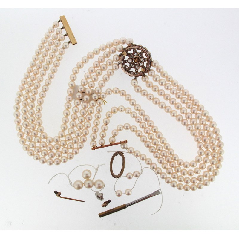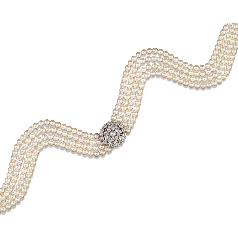 A four-row cultured pearl necklace, the pearls measure approximately 5.0 - 5.5mm, with a natural pearl set centrepiece within a surround of two rows of old circular-cut diamonds in silver and gold, the diamonds weigh approximately 5.00cts, 43cm long, with additional pearls and a jewellery screwdriver, case by Harvey & Gore