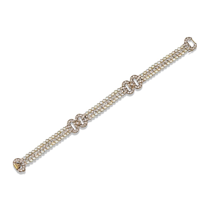 A diamond and cultured pearl set gold bracelet, formed as lines of small circular-cut diamonds within borders of slightly graduated cultured pearls and joined with three diamond-set figure of eight articulated gold links including the clasp, 20.5cm, with box