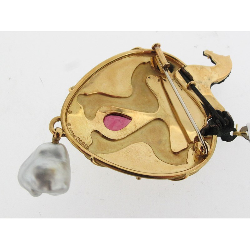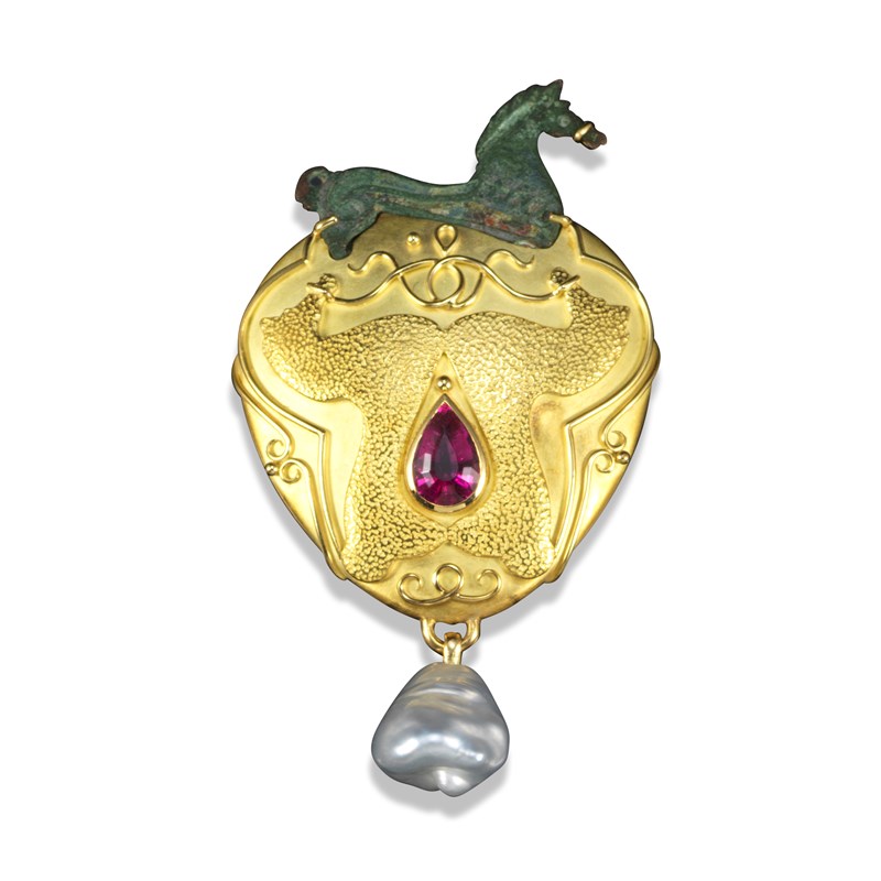 A horse themed brooch by Elizabeth Gage, the gold shield-shaped plaque with two symmetrical textured horses and scrolls, surmounted with a Romano-British bronze figure of a horse c200-300AD, set with a pear-shaped pink tourmaline and suspending a cultured pearl, signed with monogram, maker's initials and GAGE, 18ct gold marks for London 1994, 8cm high, Elizabeth Gage box