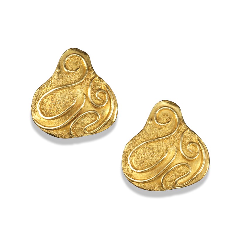 A pair of 18ct yellow gold earrings by Elizabeth Gage, the pear-shaped plaques with granulated decoration within applied scrolling tendrils, signed with monogram, maker's initials and GAGE, London marks for 1993, 3cm high, Elizabeth Gage box