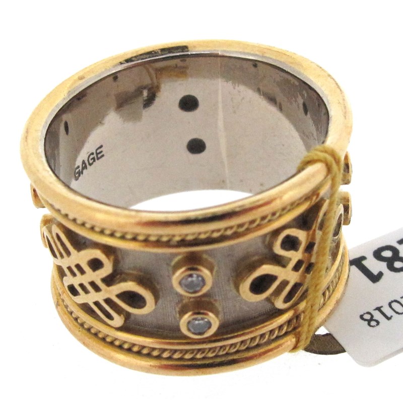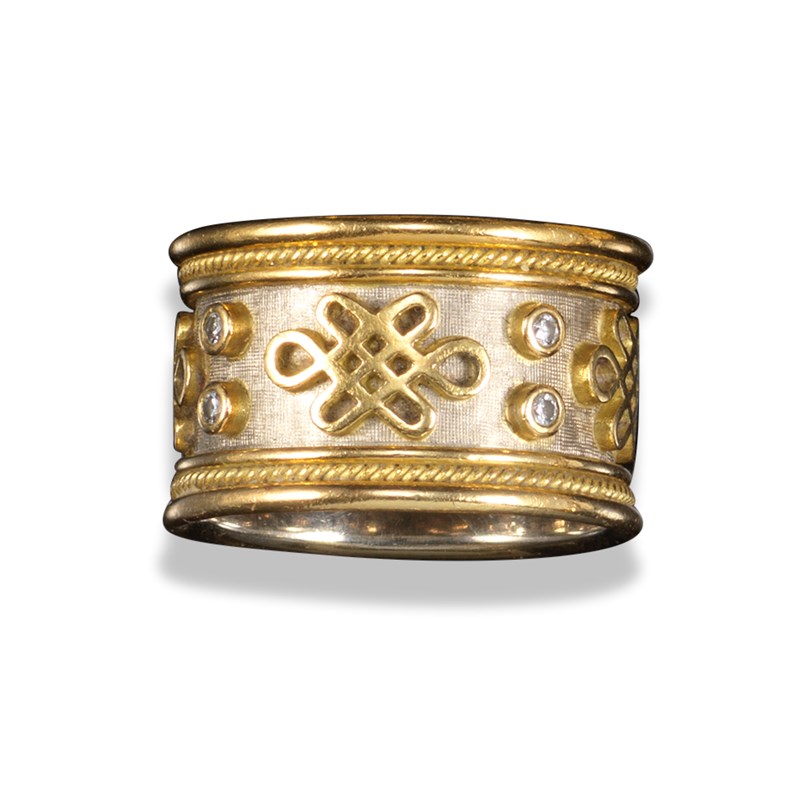 An 18ct yellow and white gold Templar ring by Elizabeth Gage, applied with knot motifs and each separated by a pair of round brilliant-cut diamonds, twisted rope borders, signed with monogram, maker's initials and GAGE, size approximately S, Elizabeth Gage box