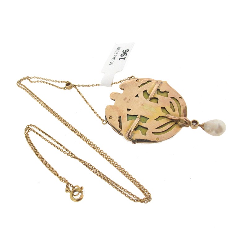 A late 19th century gold enamel and diamond pendant, in the manner of Riker Bros, depicting flowers on green enamel with a winged nymph extending from the central tulip, set with diamonds and suspending a pearl, on fine-link gold neck chain set with a diamond, pendant 4.3cm long, chain 44cm long