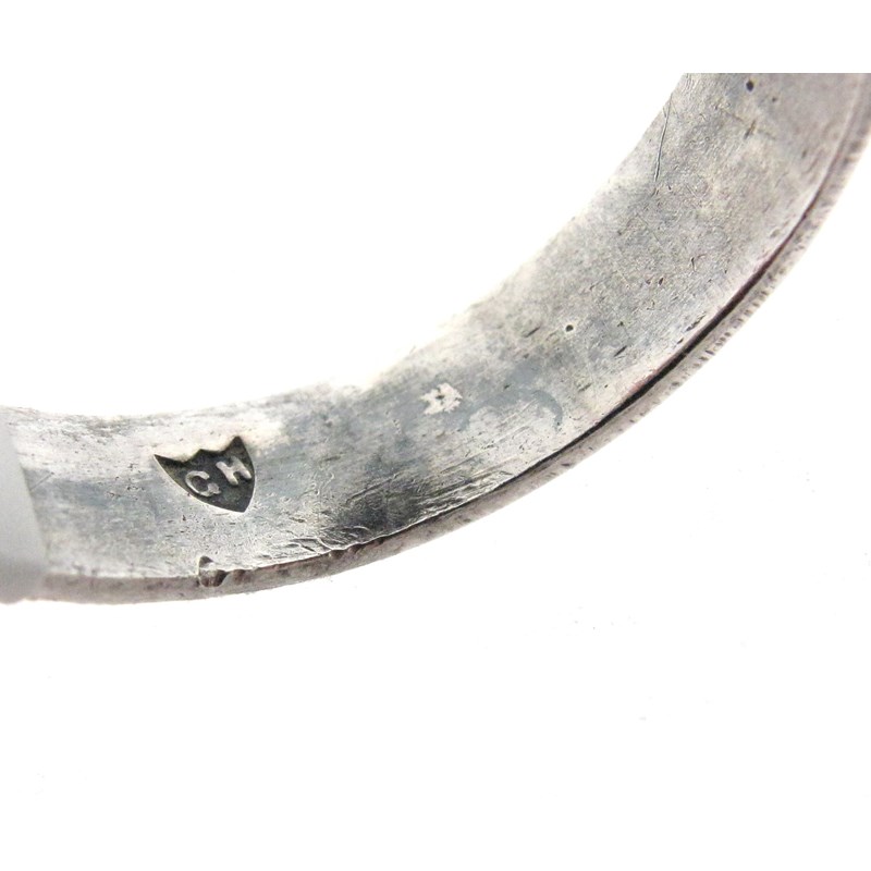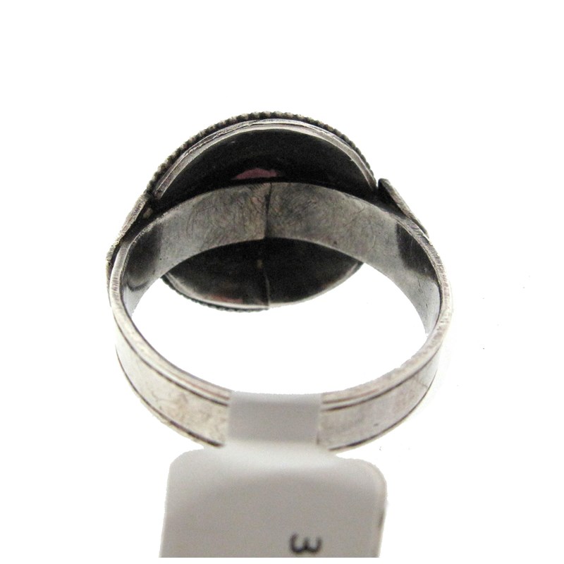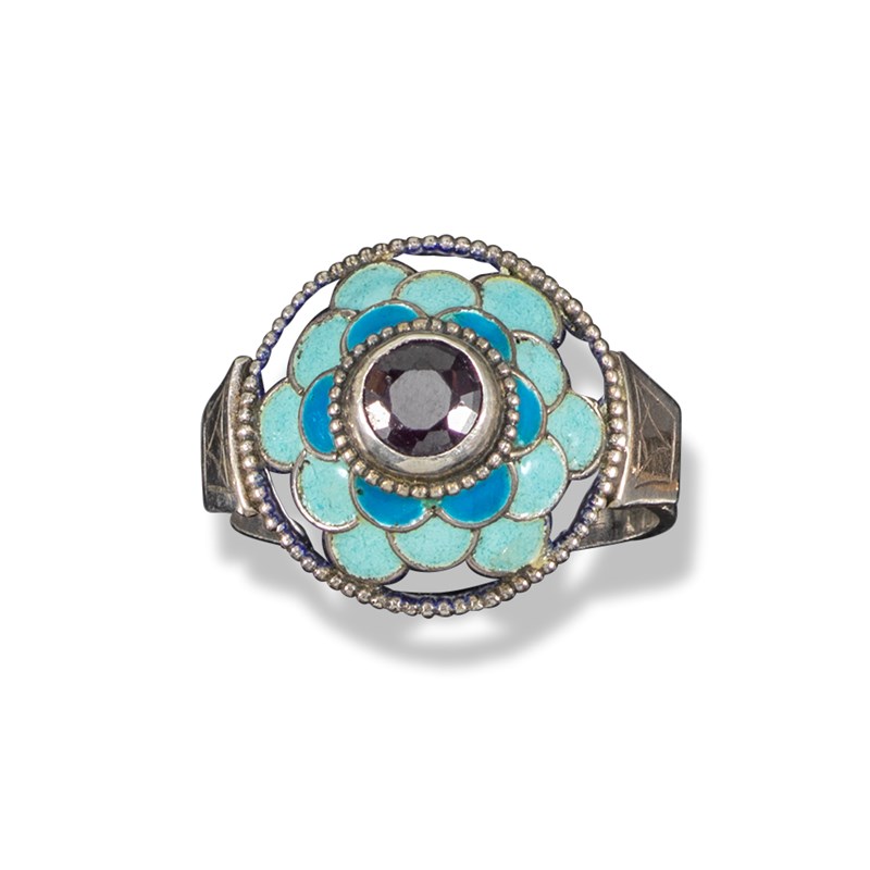A silver, garnet and enamel ring by George Hunt, c1930, the silver dome decorated with a circular-cut garnet within graduated blue and black enamel border, millegrain border in silver, maker's mark, size S 1/2, case