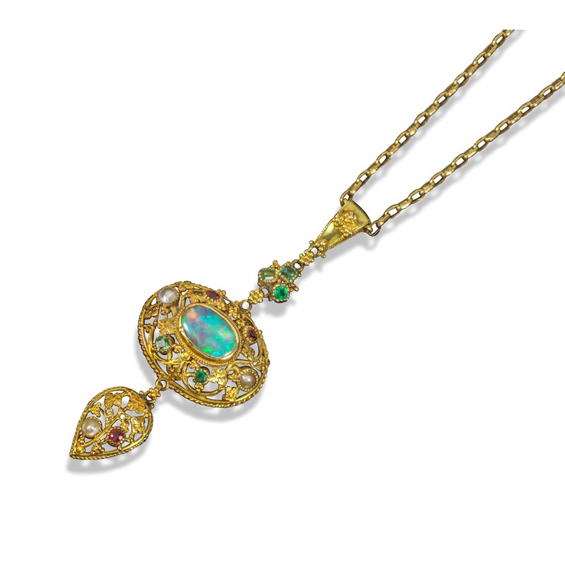 A naturalistic gold pendant by The Artificer's Guild, c1905, the centrepiece set with an oval opal in a frame of pearls, emeralds and garnets with matching gem-set pear-shaped drops in a stylised vine leaf surround with emerald trefoil suspension in gold, on modern gold chain, pendant 7cm high, chain 54cm long