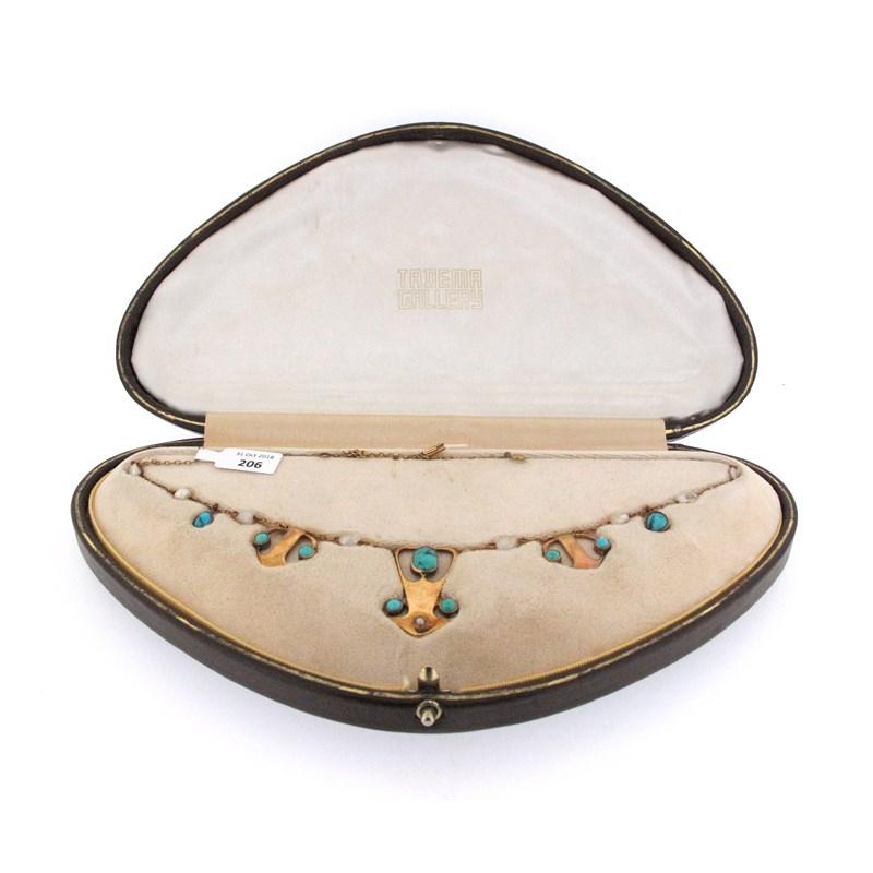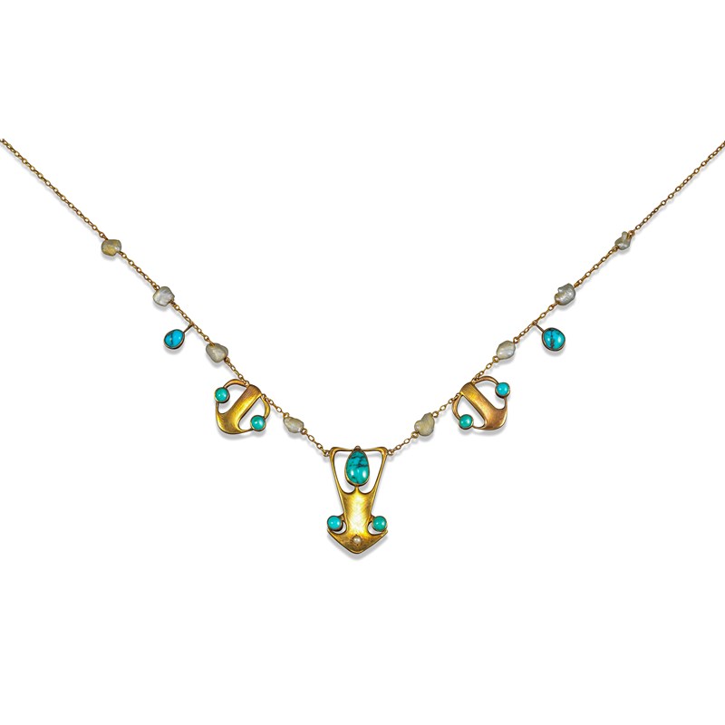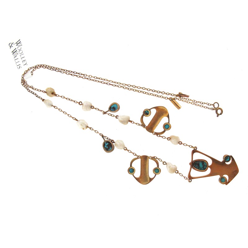 A gold and gem-set necklace, designed by Archibald Knox for Liberty & Co, designed as a series of three gold polised openwork sections studded with turquoise matrix cabochons on a gold chain necklace interspaced with eight baroque pearls, 47cm long