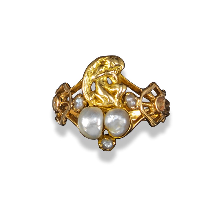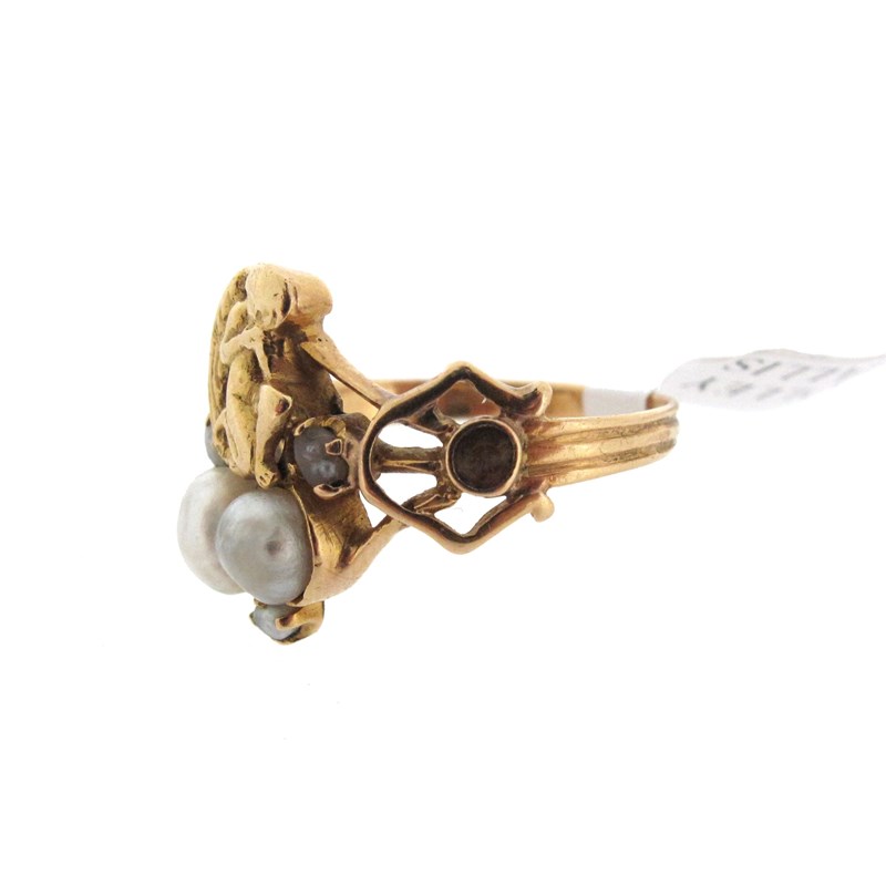 An Arts & Crafts pearl and gold ring, attributed to Henry Wilson, c1900, designed as a kneeling angelic figure above two pearls with seed pearls and entwined openwork gold shoulders on reeded gold hoop, size S