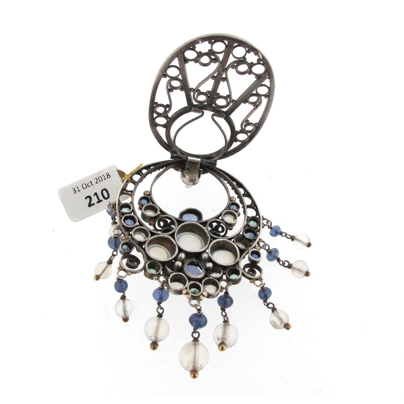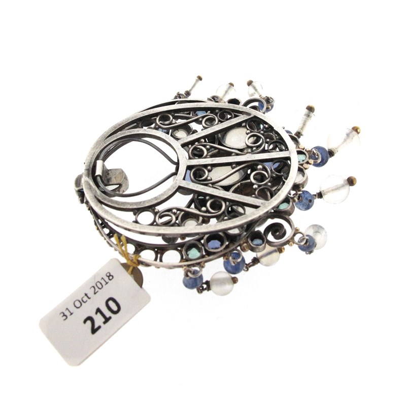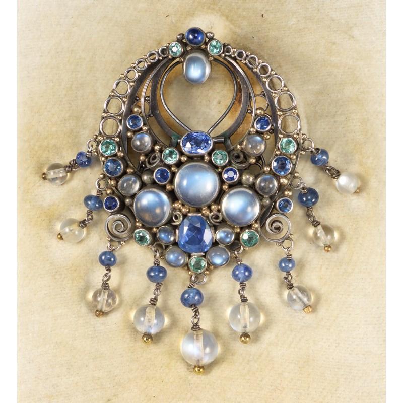 An Arts & Crafts silver brooch attributed to Dorrie Nossiter, c1930, set with a cluster of moonstones, native-cut sapphires and zircons with matching polished bead fringe, openwork silver frame and clip, 7.2cm high, fitted Dorrie Nossiter case
