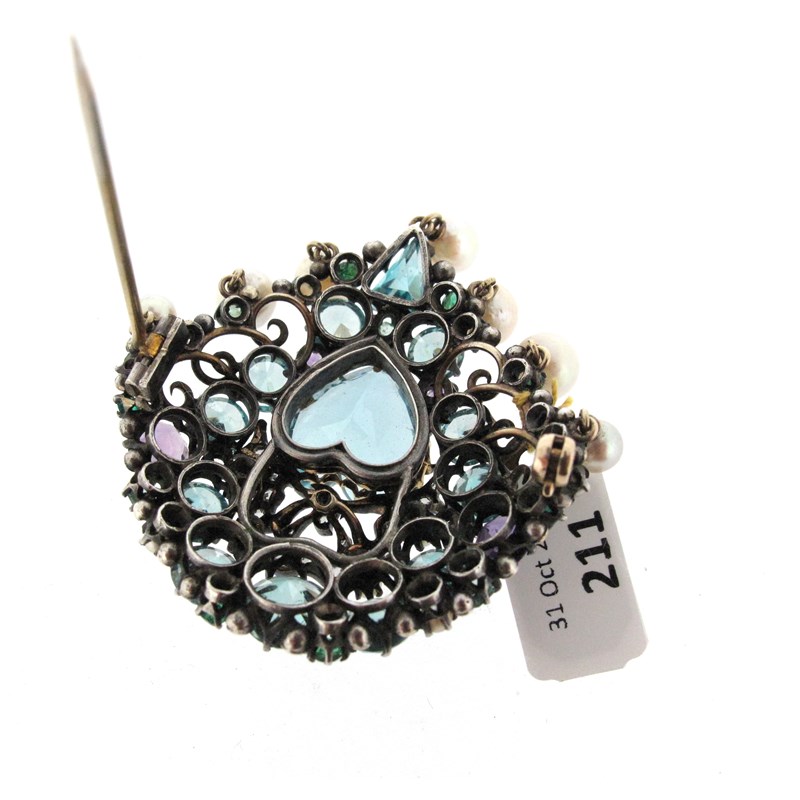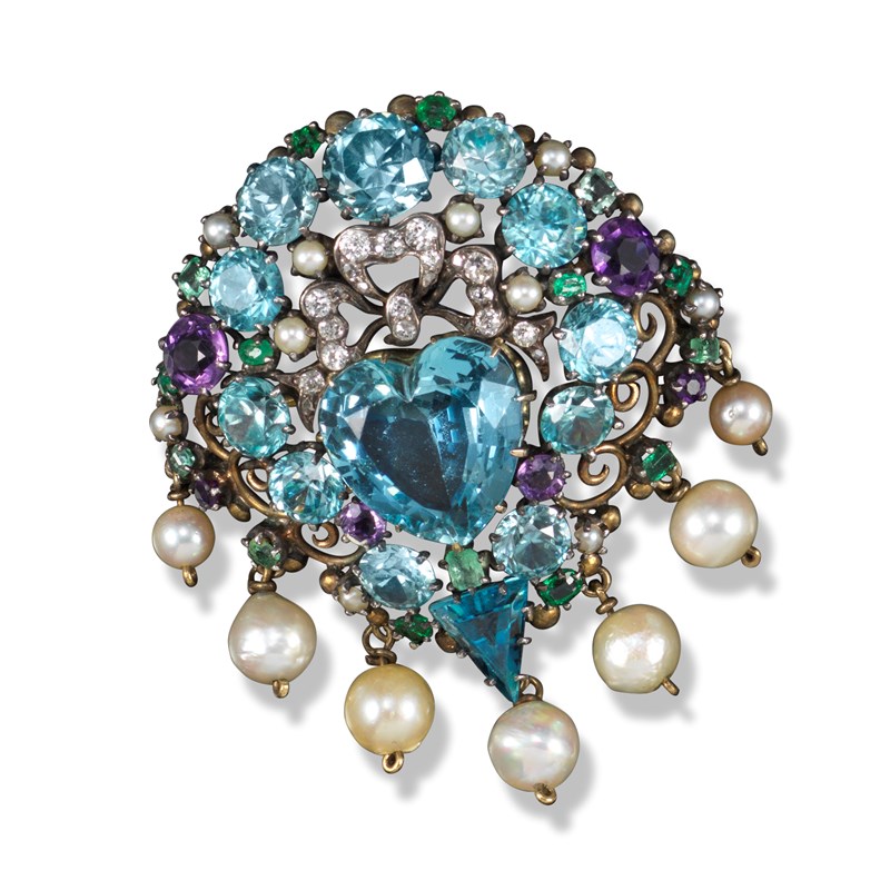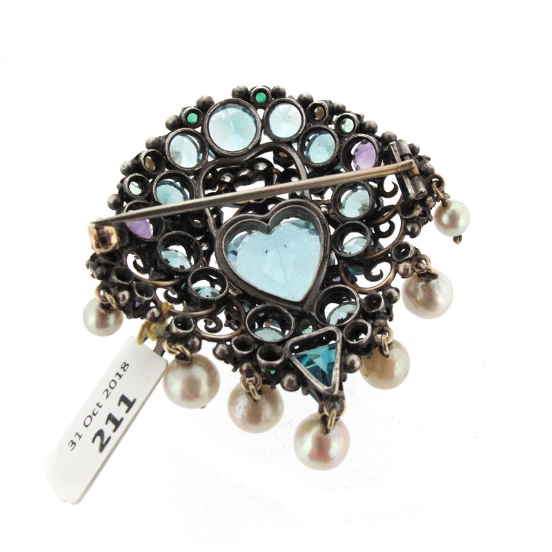 An Arts & Crafts silver gem-set brooch attributed to Dorrie Nossiter, c1930, set with a central heart-shaped aquamarine weighing approximately 8.00cts, set beneath a diamond-set bow within border of zircons, emeralds, amethysts and pearls, with a kite-shaped aquamarine and a fringe of cultured pearls, 5.5cm high