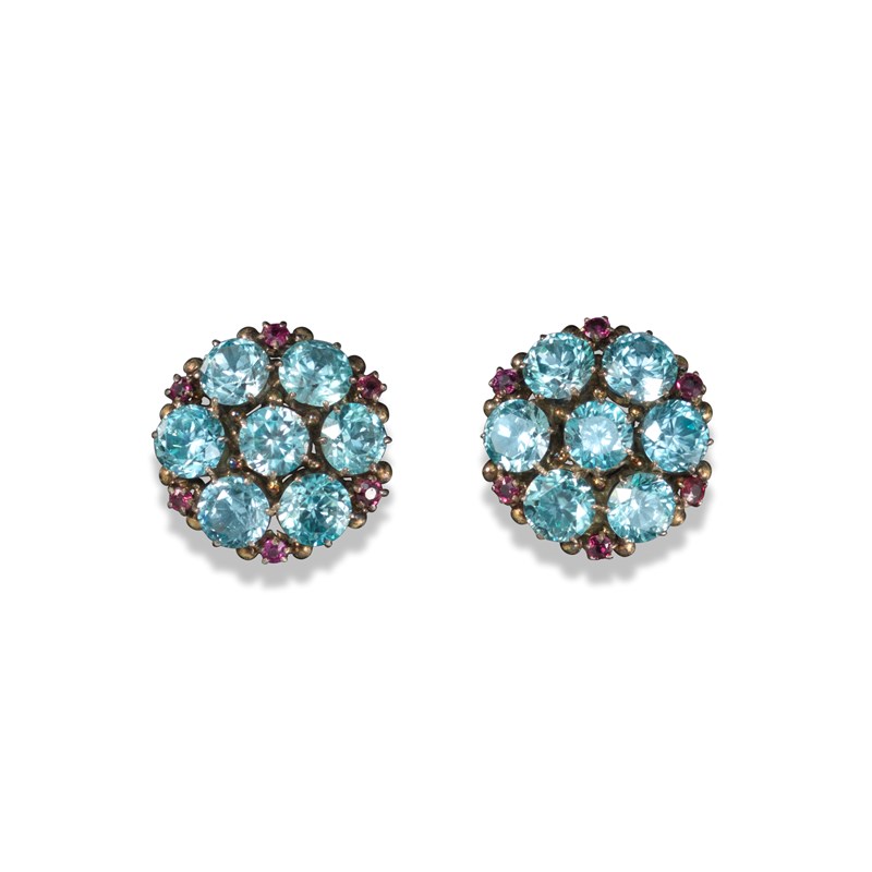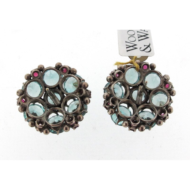 A pair of silver, blue zircon and ruby cluster ear studs attributed to Dorrie Nossiter, c1930, each set with seven blue zircons and six rubies in silver, 2.1cm wide, fitted case