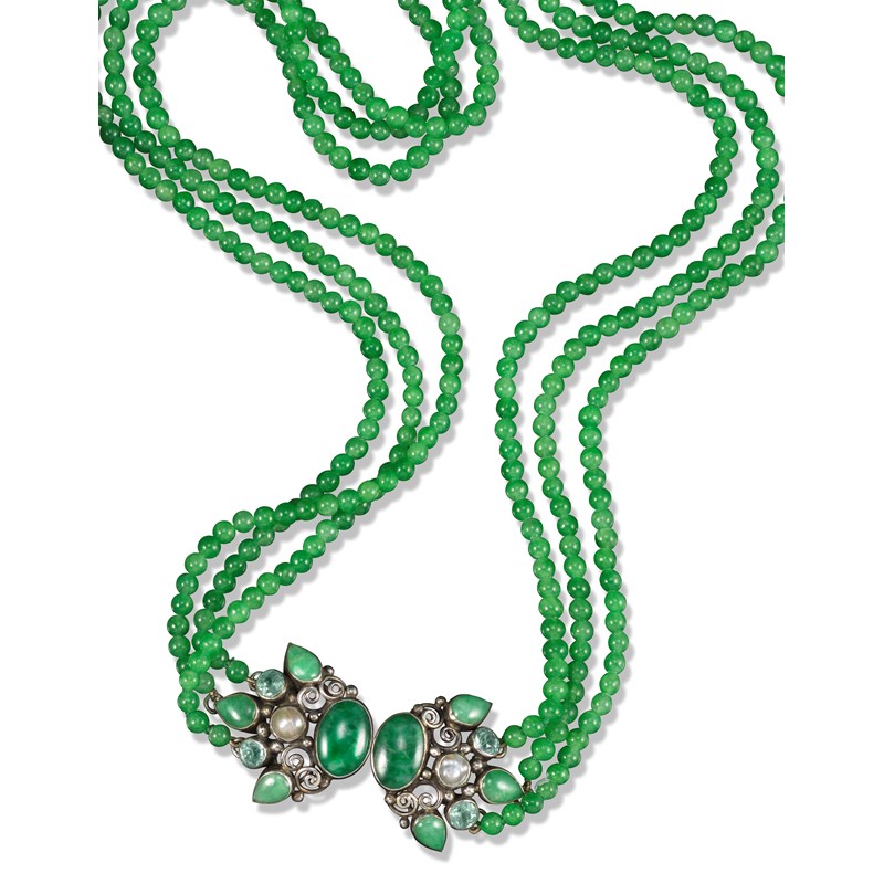 An Arts & Crafts three row green calcite bead necklace attributed to Dorrie Nossiter