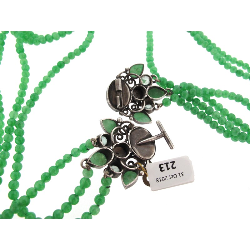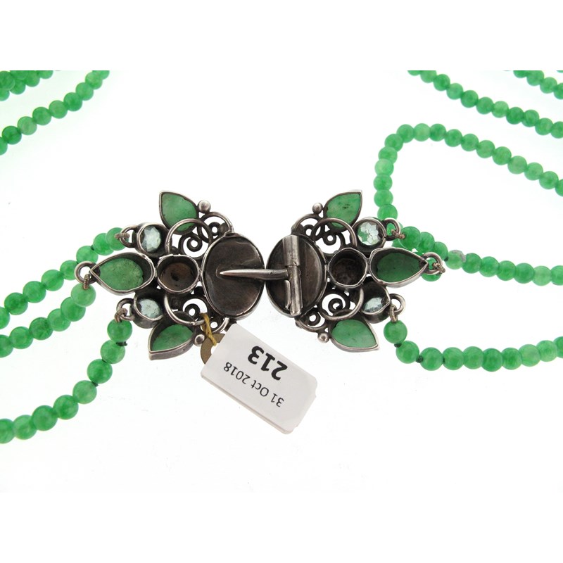 An Arts & Crafts three row green calcite bead necklace attributed to Dorrie Nossiter, c1930, the silver clasp set with two oval jade cabochons in scrolling frame with pear-shaped jade cabochons, pale blue zircons and blister pearls, 67cm long