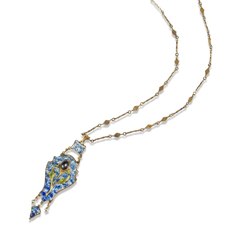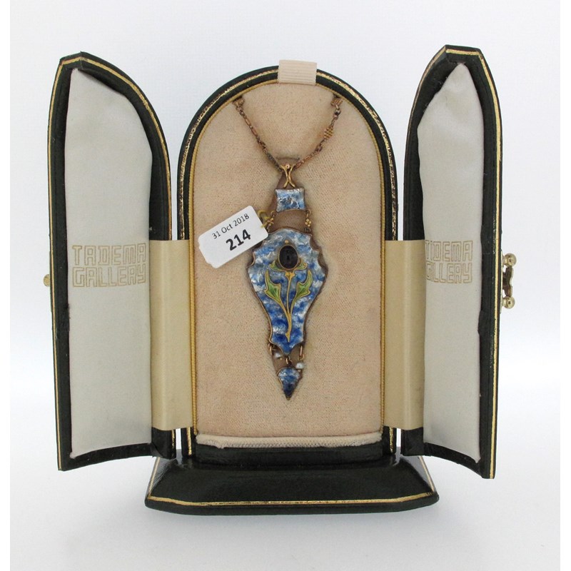 An Arts & Crafts Scottish gold pendant by James Cromar Watt, c1905, decorated with blue and iridescent white enamel with a stylized thistle set with an amethyst cabochon, on fancy-link neck chain, signed to reverse with initials, pendant 7cm long, chain 42cm long, fitted case by Tadema