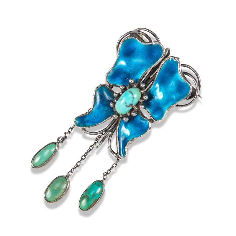 An Arts & Crafts silver enamel and turquoise brooch attributed to C.R.Ashbee for The Guild of Handicraft, c1900, the four petal flower decorated with translucent blue enamel set with a central turquoise cabochon matrix in beaded border, suspending three lines of silver chain with turquoise finials, silver tendril decoration, 7.2cm high