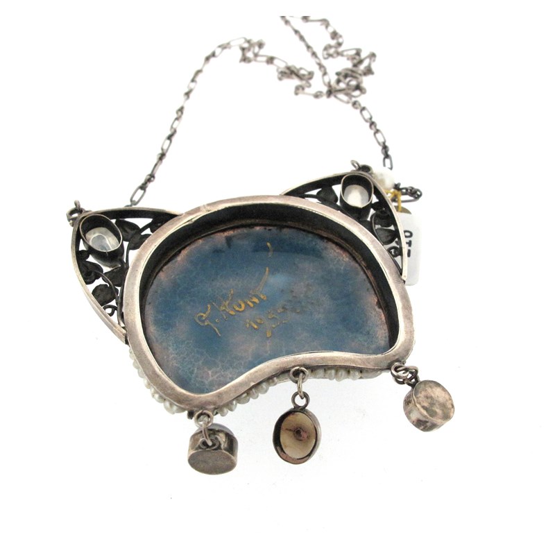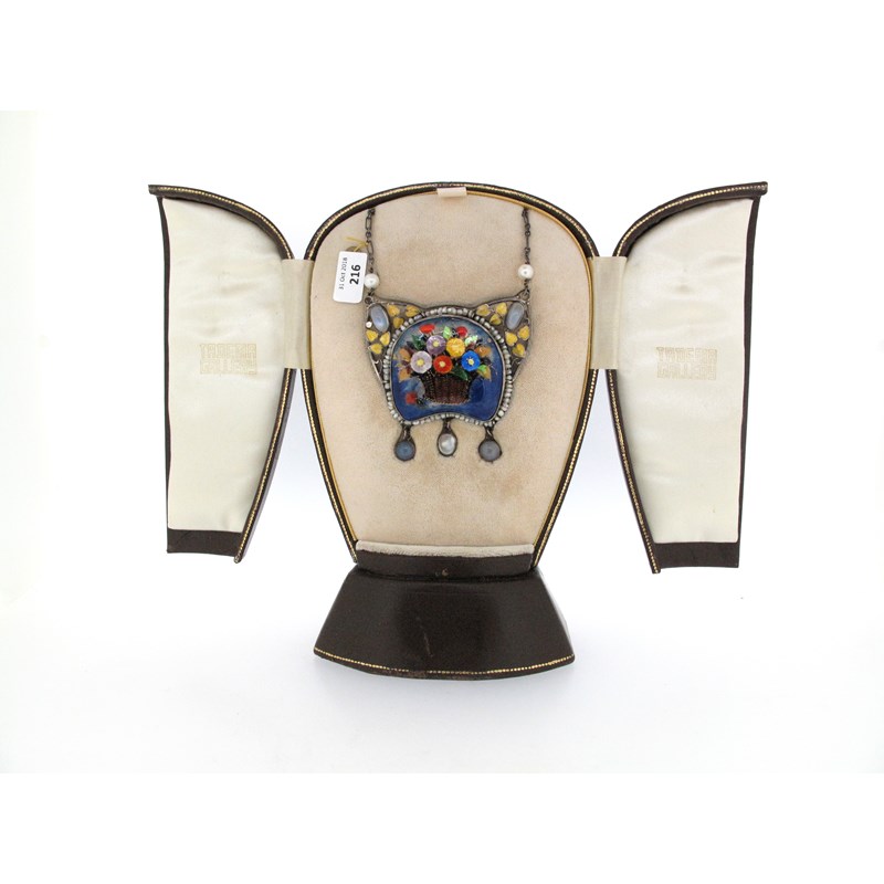 A silver and enamel gem-set pendant by George Hunt, c1933, the centrepiece decorated with polychrome enamel depicting a pannier of flowers on blue enamel ground within pierced silver foliate frame decorated with yellow enamel and moonstones, a further border of seed pearls and suspending three moonstone cabochons, on silver fetter-link chain, signed to reverse, pendant 6cm, chain 60cm, fitted case by Tadema