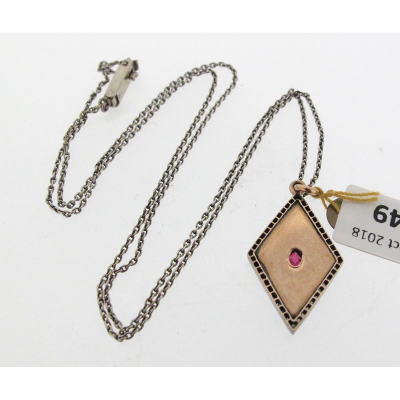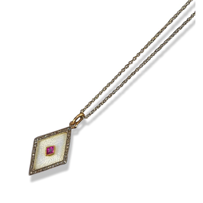 A lozenge-shaped pendant by Fabergé, centred with a lozenge-shaped ruby on white guilloche enamel ground within a border of millegrain-set rose-cut diamonds, the suspension ring marked AT for workmaster Alfred Thielmann, 56 Zolotnik and a Kokoshnik, scratched inventory no. 84263, fine link platinum neck chain, the pendant 2.9cm high, the chain 426cm long