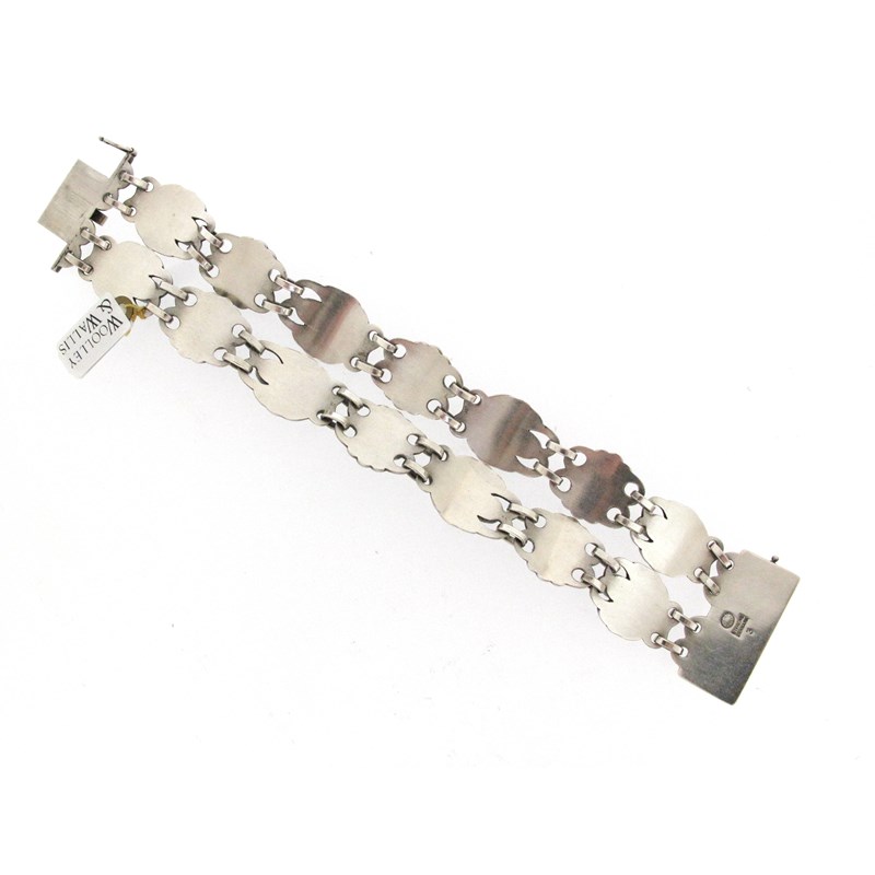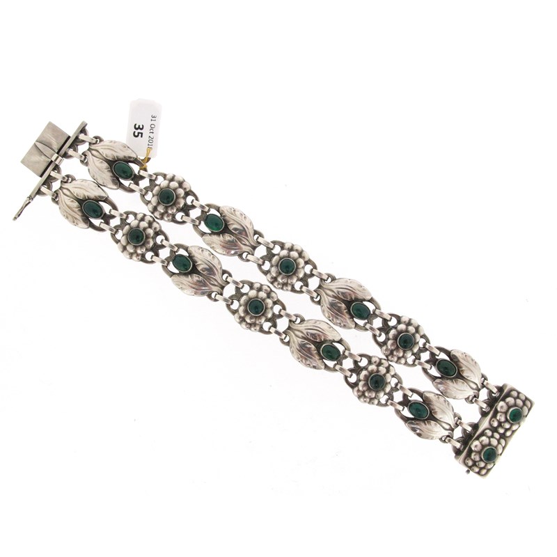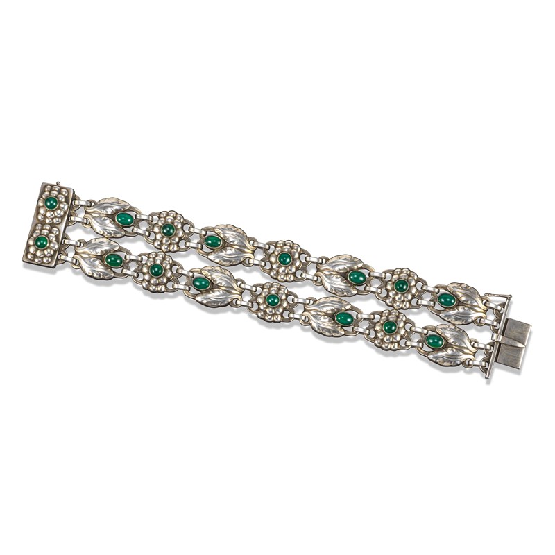 A silver and green agate foliate bracelet, design no. 3, post-1945, formed as two rows of foliate links, each set with a green agate cabochon, with conforming oblong box clasp, stamped Sterling Denmark and with maker's mark, 18.5cm long
