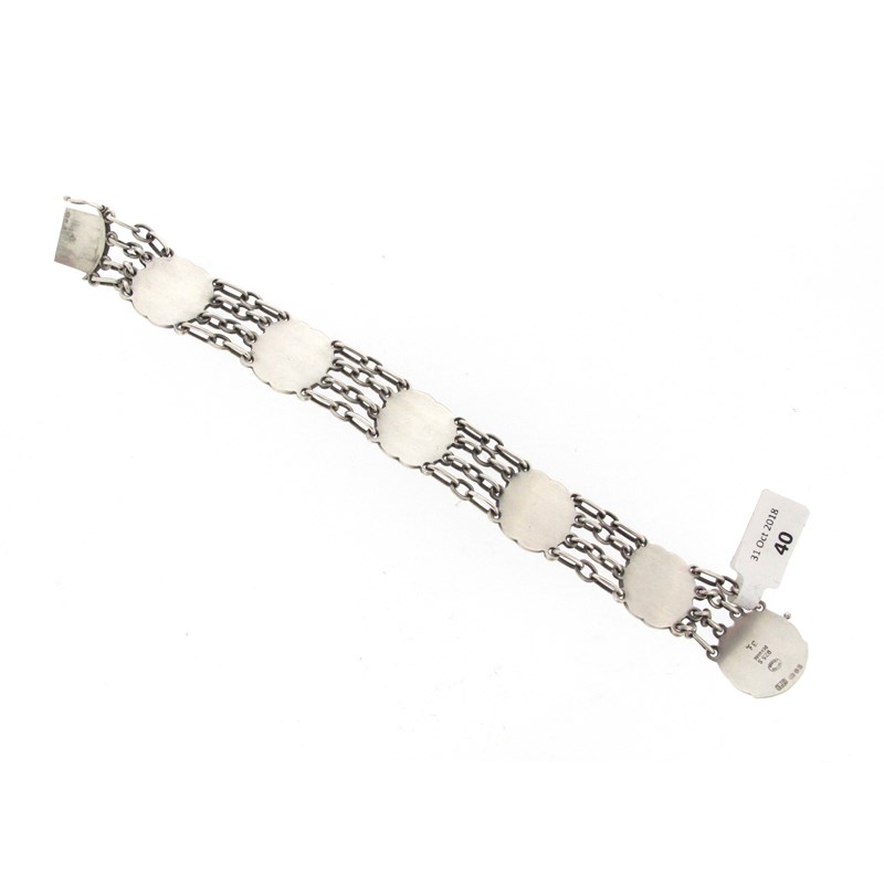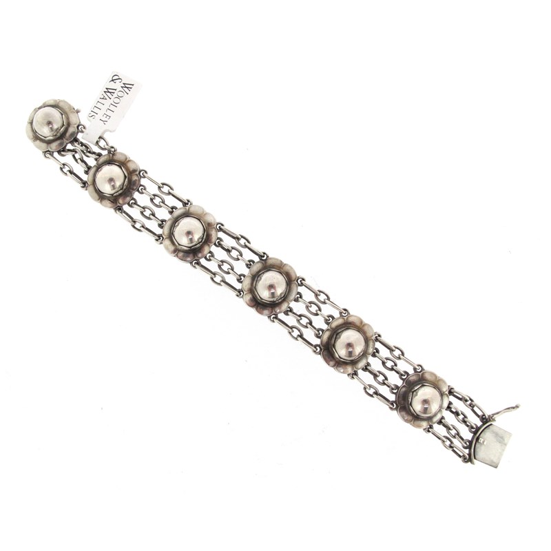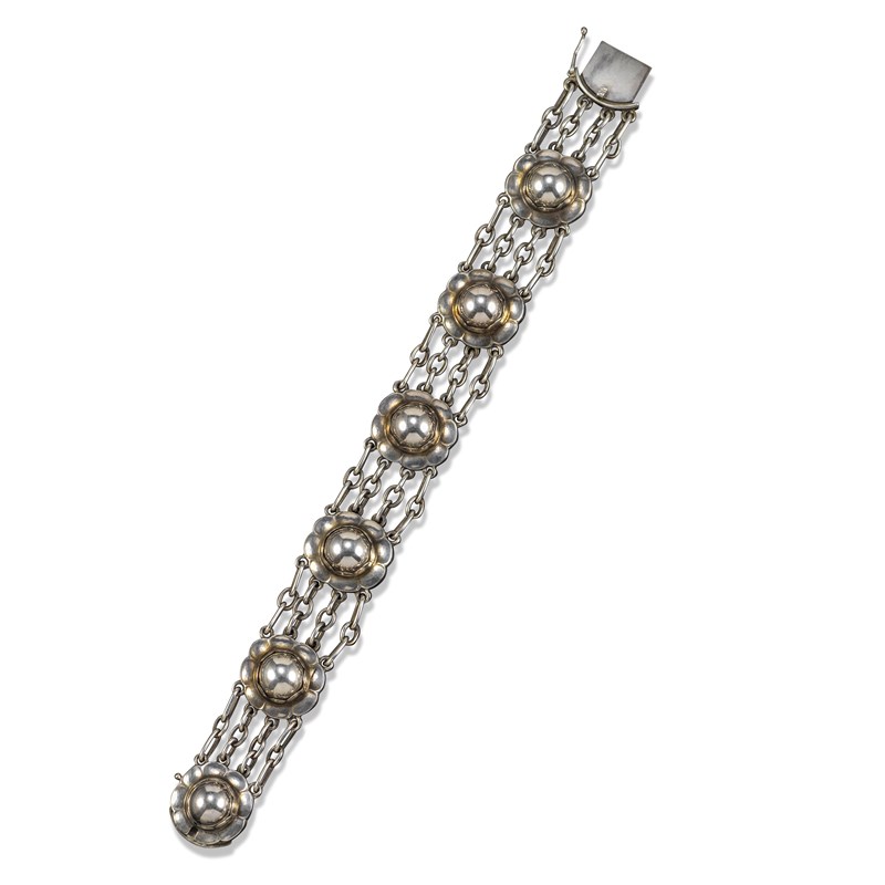 A silver foliate bracelet by Georg Jensen, design no. 31, c1983, the flower head links formed as circular silver bosses with scallop border, with four-row oval connection links, stamped 925S Denmark and GJLtd, with London import marks for 1983 and with maker's mark, 18cm long