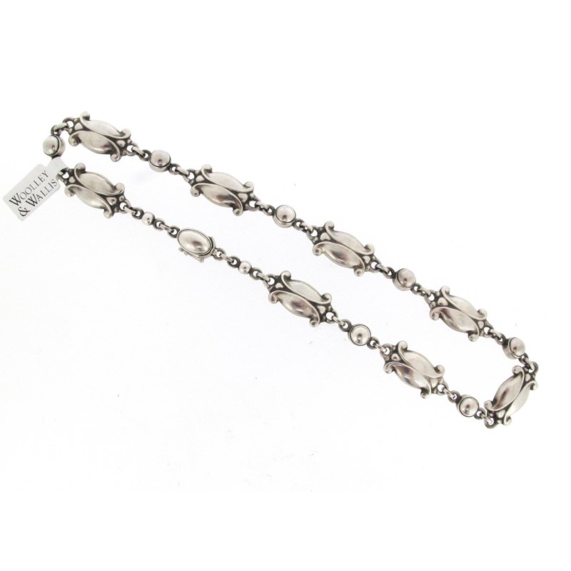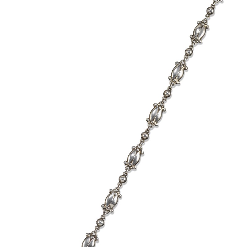A silver 'Seed & Pod' necklace by Georg Jensen, design no. 11, post-1945, each scrolling foliate link alternately-set between domed silver bosses, with box clasp with safety catch, stamped Sterling Denmark, with maker's mark, 41cm long