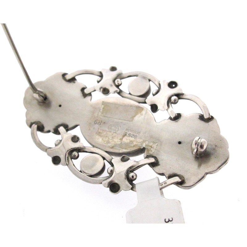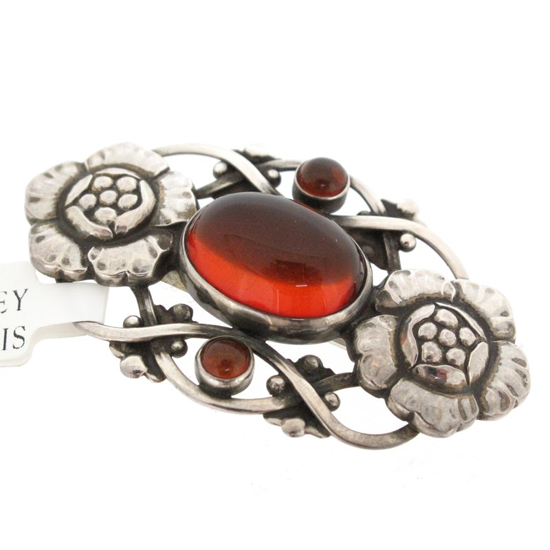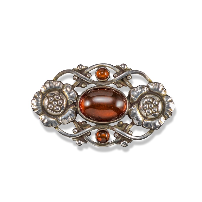 A silver and amber foliate pendant by Georg Jensen, design no. 89, c1982, the open-work foliate frame set with three amber cabochons and flower head terminations, stamped 925 S Denmark and GJLtd, London import marks for London 1982 and with maker's mark, 5.7cm wide