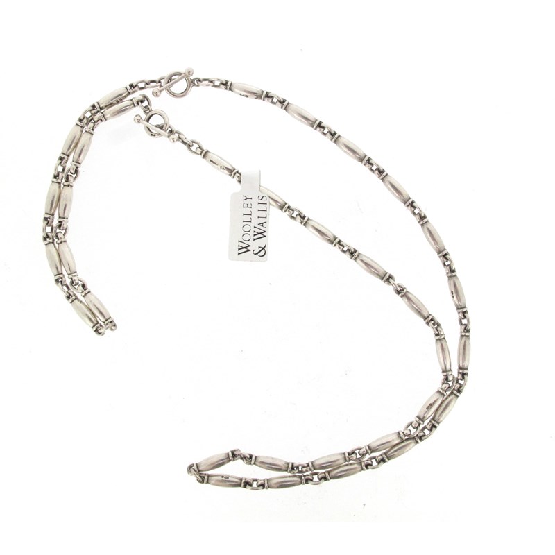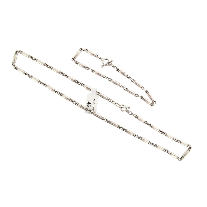 A silver necklace and bracelet suite by Georg Jensen, designs no. 40 & 43 by Henry Pilstrup, c1984, designed as a line of barrel-form links with oval-link connections, toggle clasps, both stamped 925 Denmark and GJLtd, London import marks for 1984 and with maker's mark, necklace 42cm long, bracelet 19.3cm long