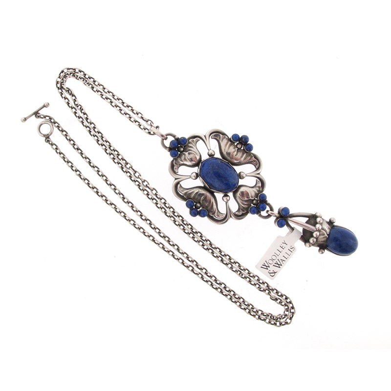 A silver and lapis lazuli foliate pendant by Georg Jensen, design no. 40, c1985, the large oval lapis lazuli cabochon set within foliate silver frame, with further lapis lazuli cabochons forming the stamens of flowers, suspending a further lapis lazuli-set beaded bud-form silver drop, on oval-link silver chain with toggle clasp, stamped 925 S Denmark and GJLtd, London import marks for 1985 and with maker's mark, pendant 10.8cm high, chain 94cm long