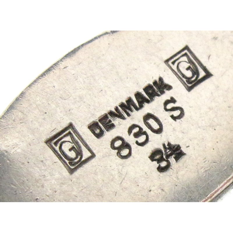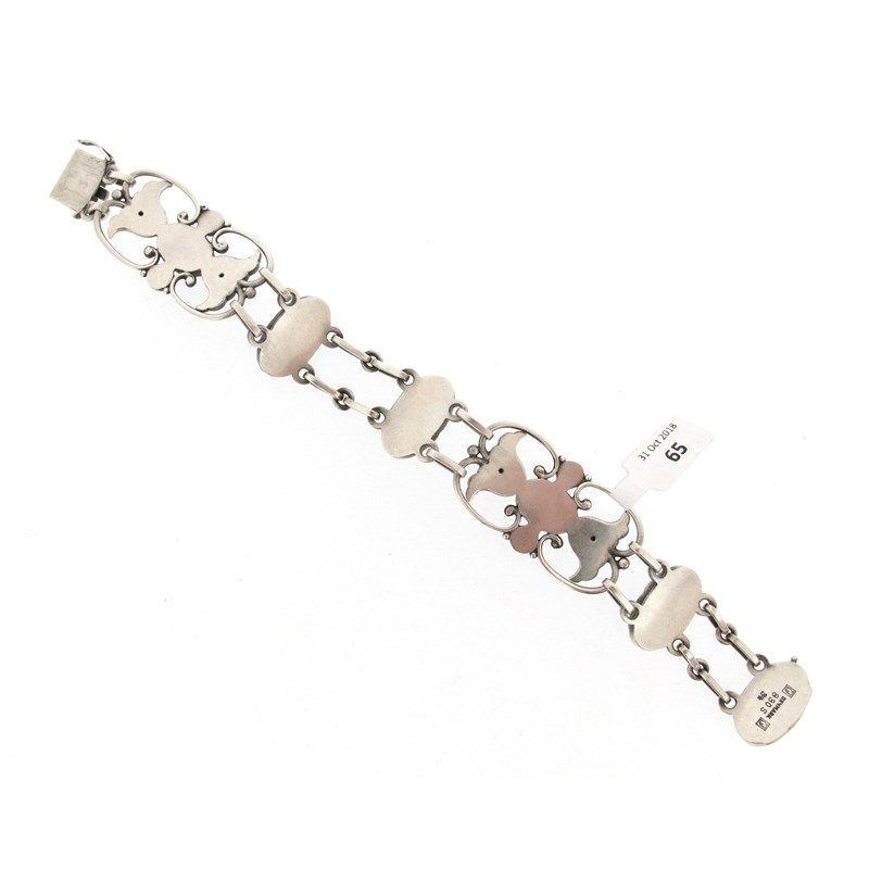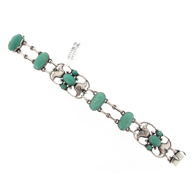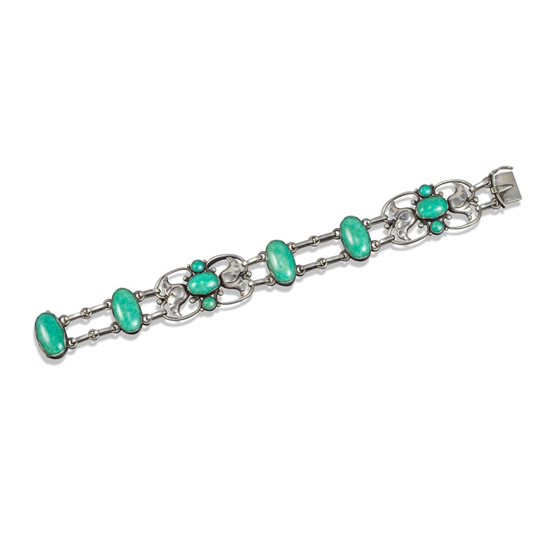 An amazonite and silver foliate bracelet by Georg Jensen, design no. 34, c1933, the two openwork foliate links with beaded and scroll decoration, alternately set with pairs of amazonite cabochons within scallop border and oval connections, stamped 830S Denmark and with maker's mark, 20cm long