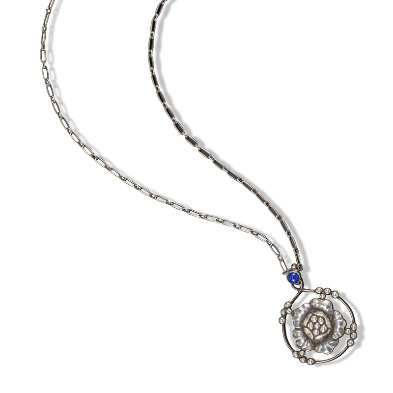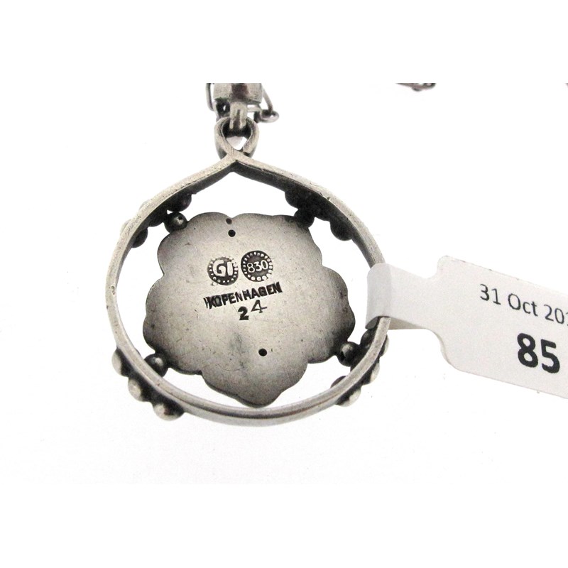 A silver and lapis lazuli flower head pendant by Georg Jensen, design no. 24, c1915-1930, the silver flower head within beaded frame, the suspension set with a lapis lazuli cabochon, on fetter link silver chain with toggle clasp, stamped 830 Copenhagen, with maker's mark, pendant 3cm high, chain 60cm long