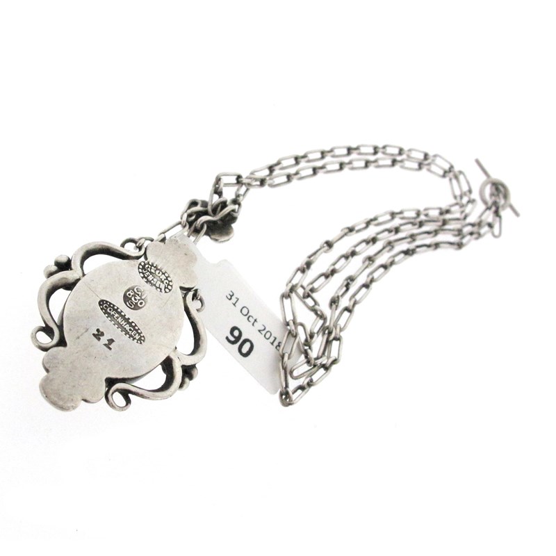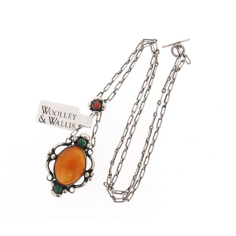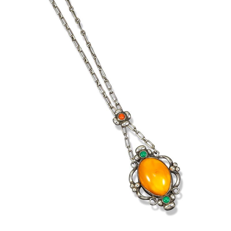 A silver, amber, malachite and coral pendant by Georg Jensen, design no. 21, c1915-1927, the silver foliate frame set with two malachite cabocons and a central amber cabochon, suspending from a coral-set flower head on silver fetter-link chain with toggle clasp, stamped GI, 830S Copenhagen, with maker's mark, lower pedant 3.3cm high, chain 42cm long