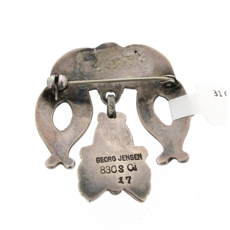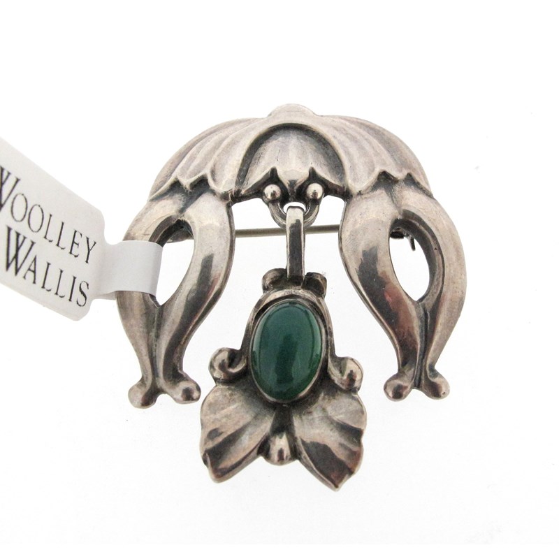 A silver and green agate brooch by Georg Jensen, design no. 17, c1909-1914, the silver foliate upper section suspending a further foliate drop setion set with a green agate cabochon, stamped 830S and with maker's mark, 4cm high