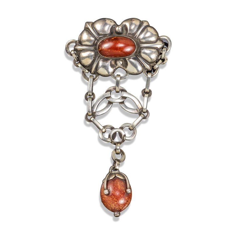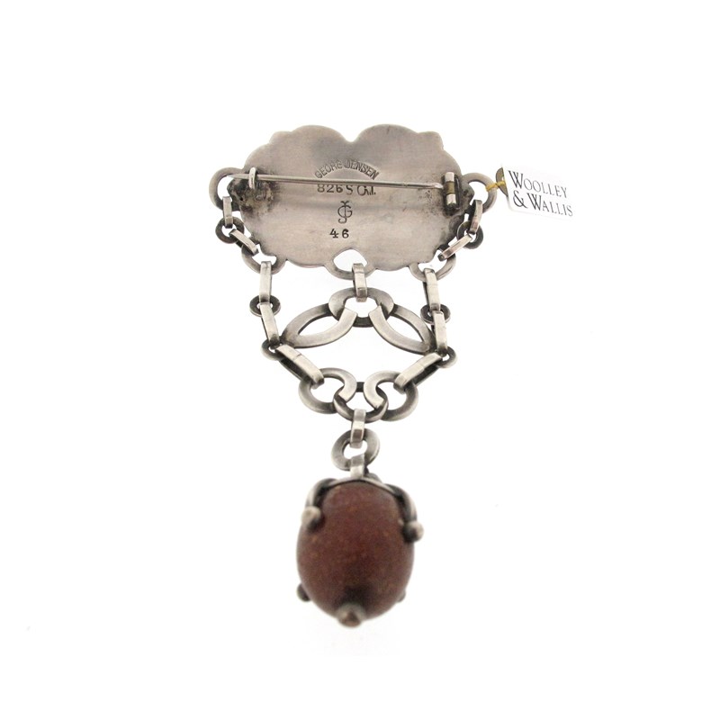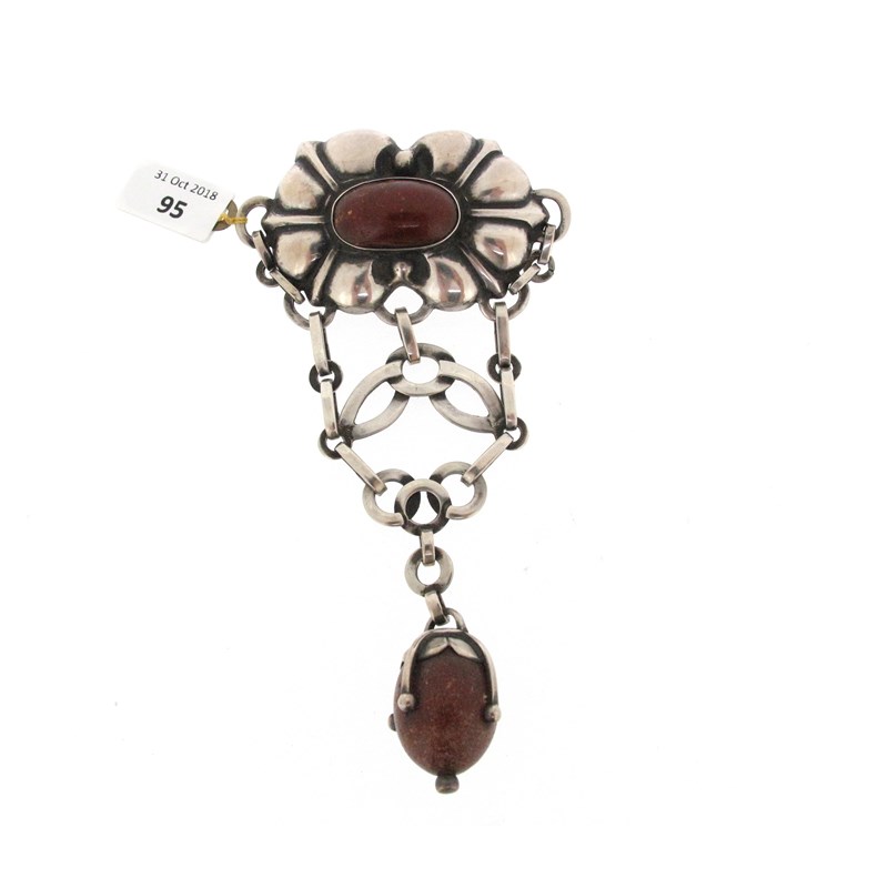 A silver and amber pendant by Georg Jensen, design no. 46, c1909-1914, set with an oval dark brown amber cabochon, with chain-link swags suspending a large amber ead drop within silver cage-work frame, stamped 826 S, G.I., signed and with maker's mark, 10.8cm long