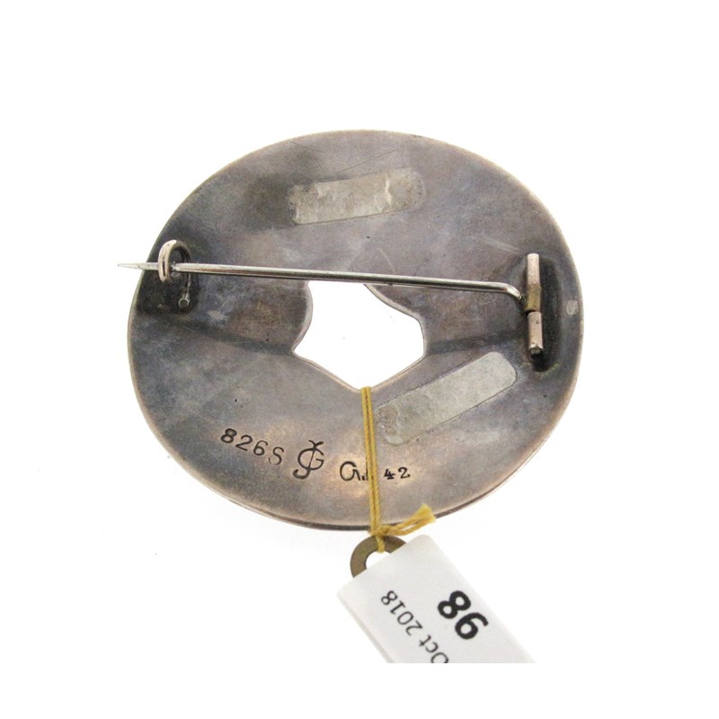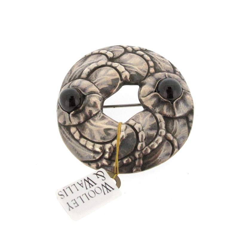 A silver and garnet foliate brooch by Georg Jensen, design no. 42, c1904-1908, the silver roundel set with two garnet cabochons, stamped 826S G.I. and with maker's mark, 5cm wide