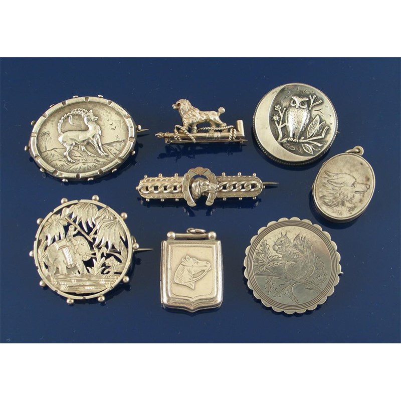 ANIMALS. Tiger hunt with elephant, Birmingham 1879, 3.5cm. Crescent and owl. Red squirrel with acorn. Dog and horseshoe, Birmingham 1890. Poodle with riding crop. Fox locket. Horse head locket, Birmingham 1898. Ibyx. (8)