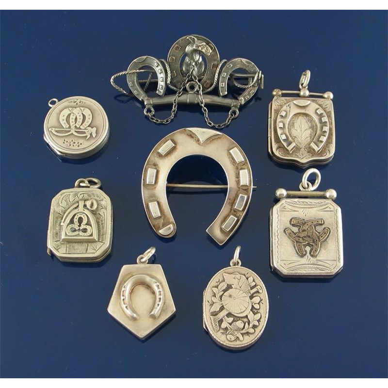 Three horseshoes with dog, 5cm wide. Horseshoe. Double horseshoe locket, Birmingham 1902. Triple horseshoe locket. Horseshoe locket. Horseshoe locket pendant, Birmingham 1885. Horn locket pendant. Dog and cat locket pendant, Birmingham 1886. (8)