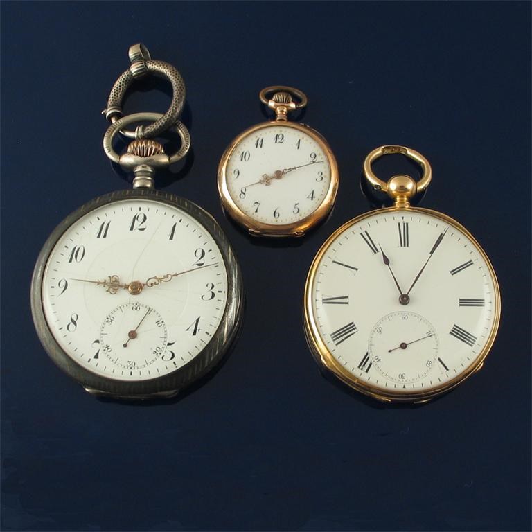 An 18ct gold open faced pocket watch, white enamel dial with black Roman numerals and subsidiary seconds dial. The inner case signed Ernst Kutter Hof Uhrmacher, Stuttgart, in damaged case. With a small gold open faced fob watch (cased) and an open faced niello decorated pocket watch, cased.