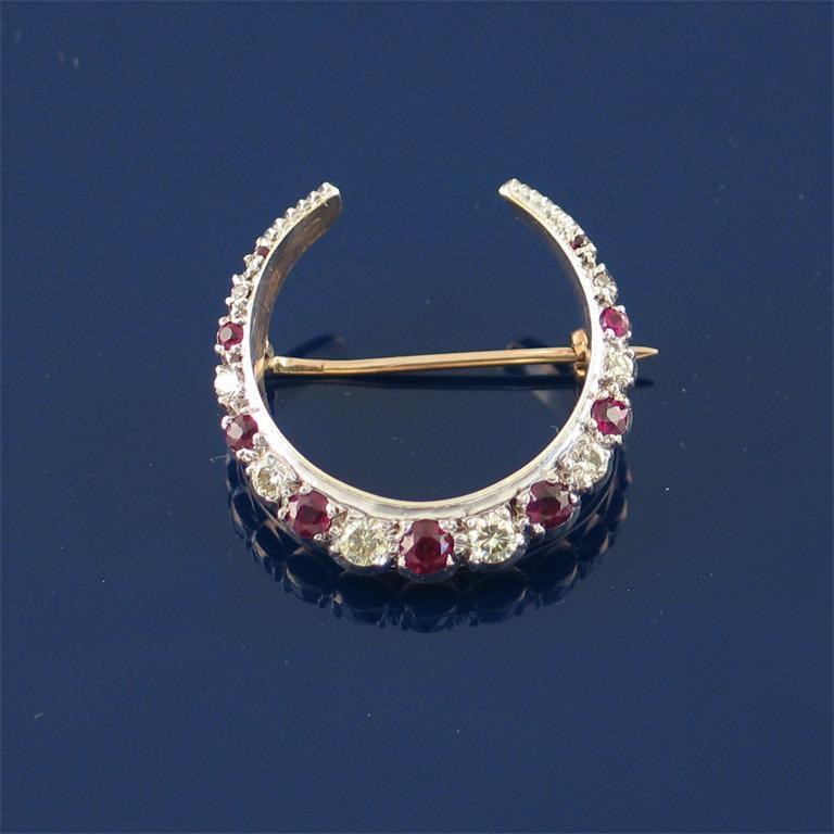 A diamond and garnet set closed crescent brooch, alternately set with graduated circular cut diamonds and garnets, set in 9ct gold.