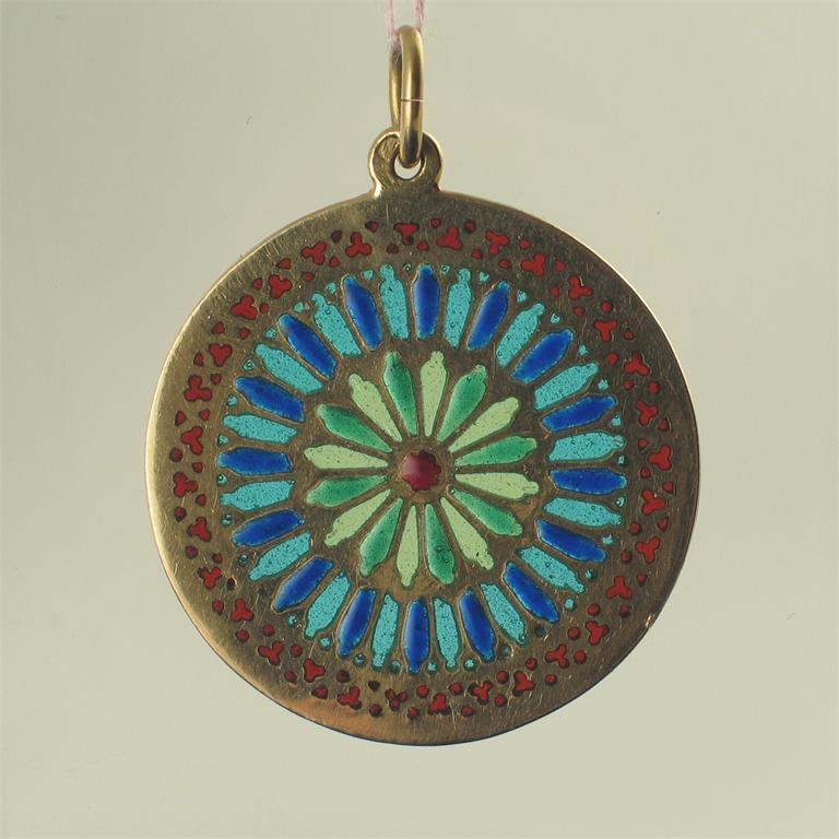 A gold circular pendant, with plique a jour decoration. French marks. 2.5cm diameter.