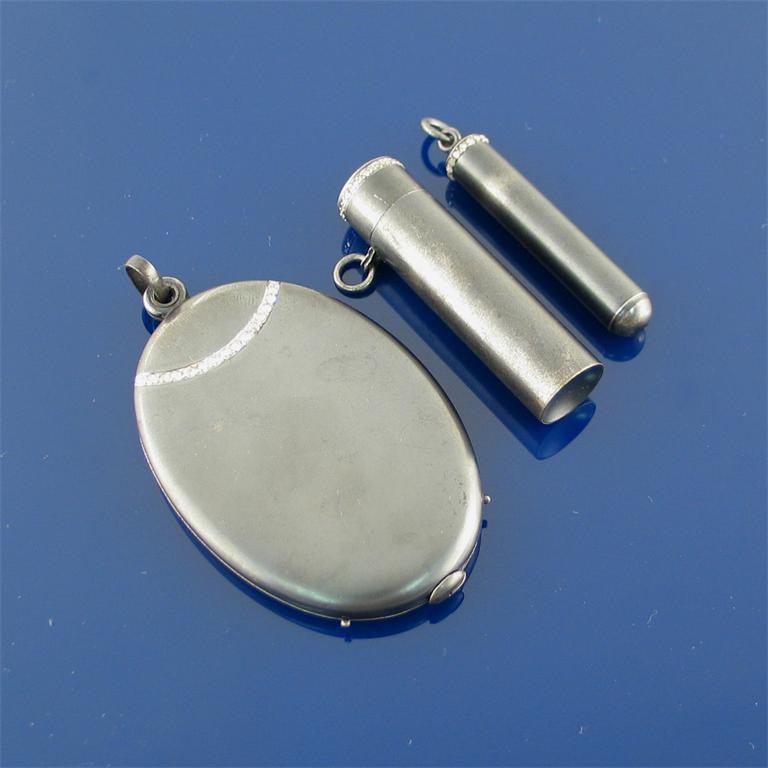 A gun metal oval swivel mirror, mounted with rose cut diamonds, 7cm high. A gold and gun metal telescopic propelling pencil mounted with rose cut diamonds (one missing) and a gold and gun metal lipstick container set with rose cut diamonds.