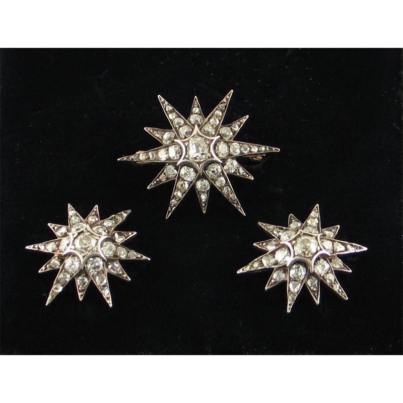 A Victorian diamond set, twelve ray, star brooch, set in silver on gold with a matching pair of similar smaller earrings. Fitted case by S. J. Phillips.