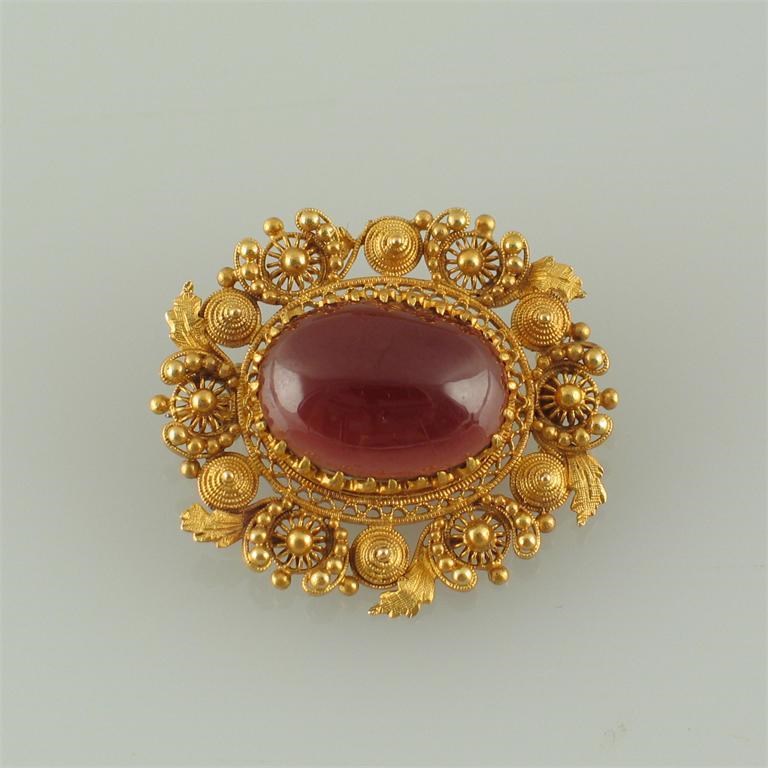 A Regency gold garnet brooch, centred with an oval shape cabochon garnet to the cannetille frame. 2.8cm wide.