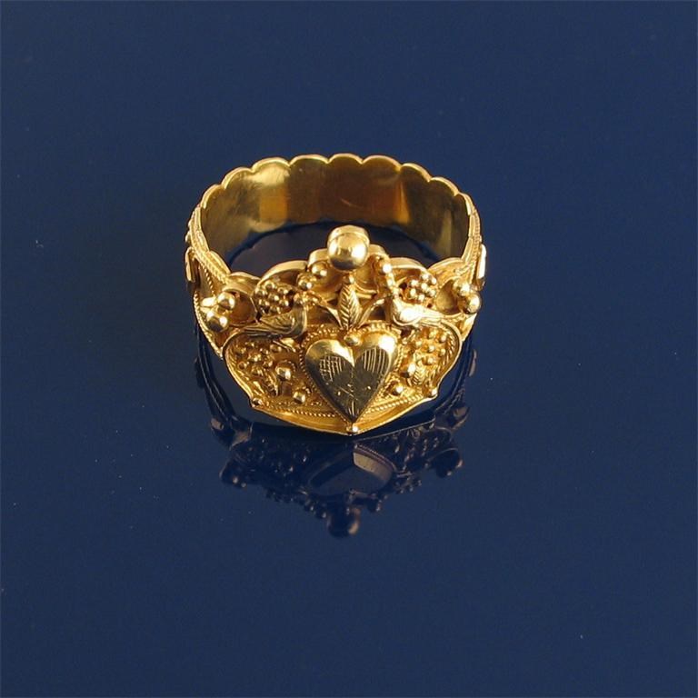 A yellow gold decorative ring, centred with a heart within foliate design shaped and tapered shank. Pricked inscription dated 1787. Possibly German.